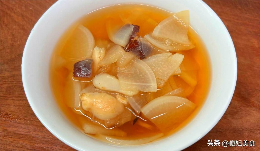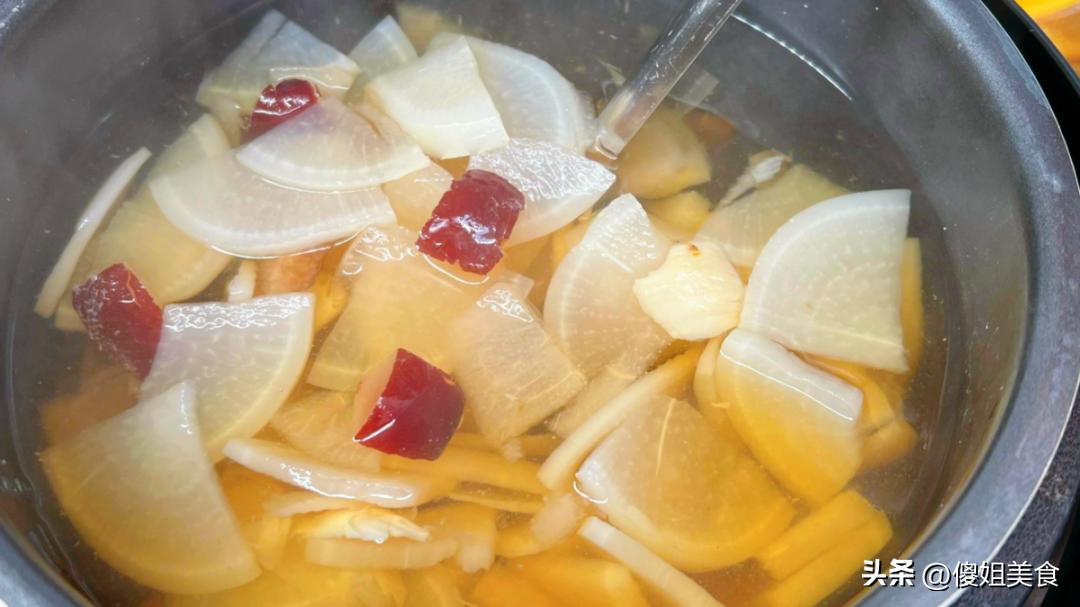 【具體做法】1、白蘿蔔清洗乾淨,無需削皮,切成均勻片狀,雪梨削皮切塊兒,大棗去核對半切開,幹百合提前用溫水泡軟,荸薺去皮切小塊兒,如果家裏只有白蘿蔔和雪梨,那就直接用這兩樣煮湯也是可以的,家裏有老人不能喫甜的,就不放大棗和冰糖。