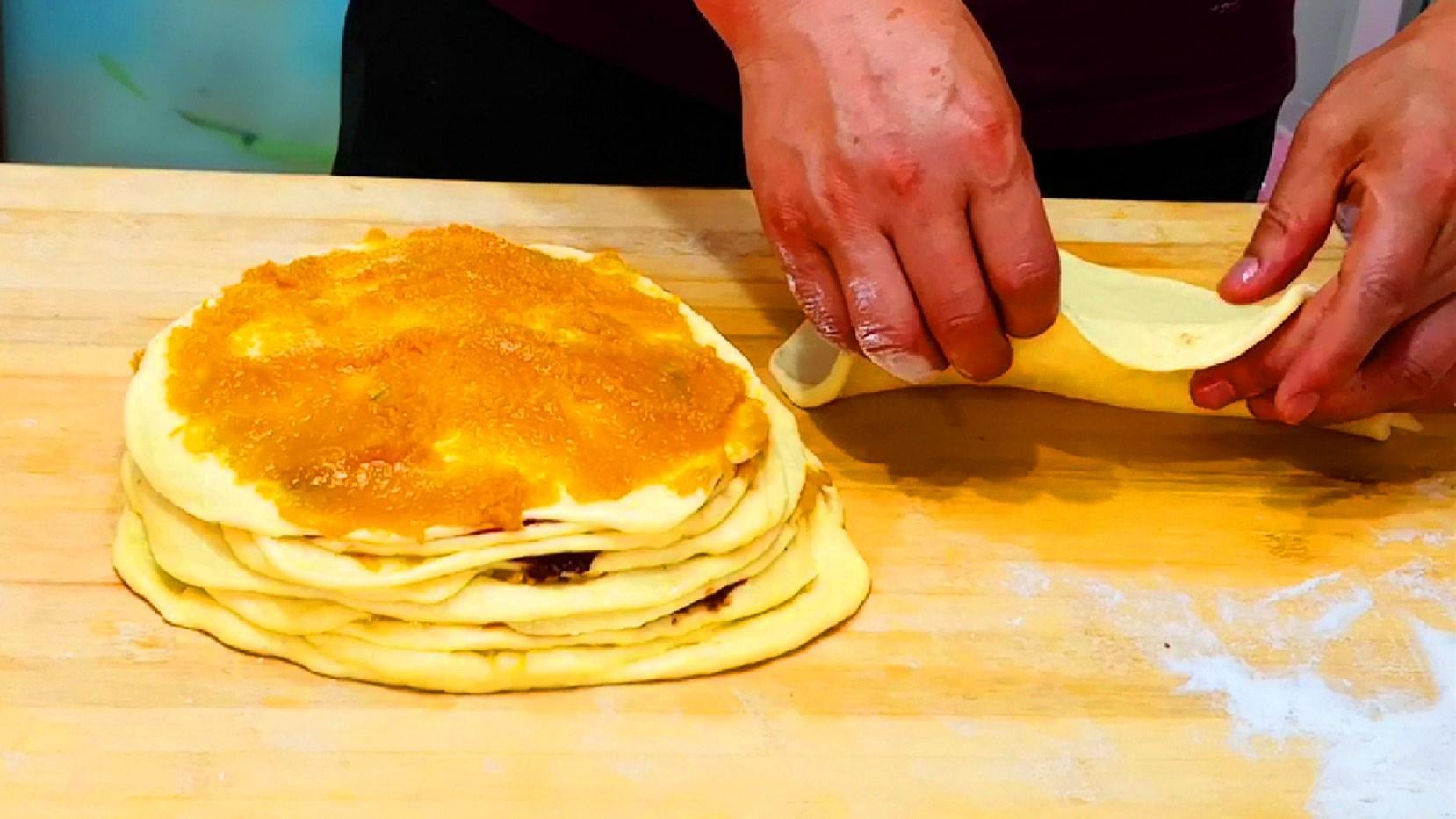 3.發好的面取出後,多揉搓一會兒排排氣,揉勻以後再把它搓成長條,分成大小均勻的9等份,再把每一份都按扁擀薄。接着準備一個平盤,底盤刷油防止粘連, 然後鋪上一層擀好的餅皮,在餅皮上均勻地塗上一層紅薯泥後,再蓋上一層餅皮,然後再地塗上一層豆沙,塗抹均勻後再蓋上一層餅皮,接着再抹上一層南瓜泥。