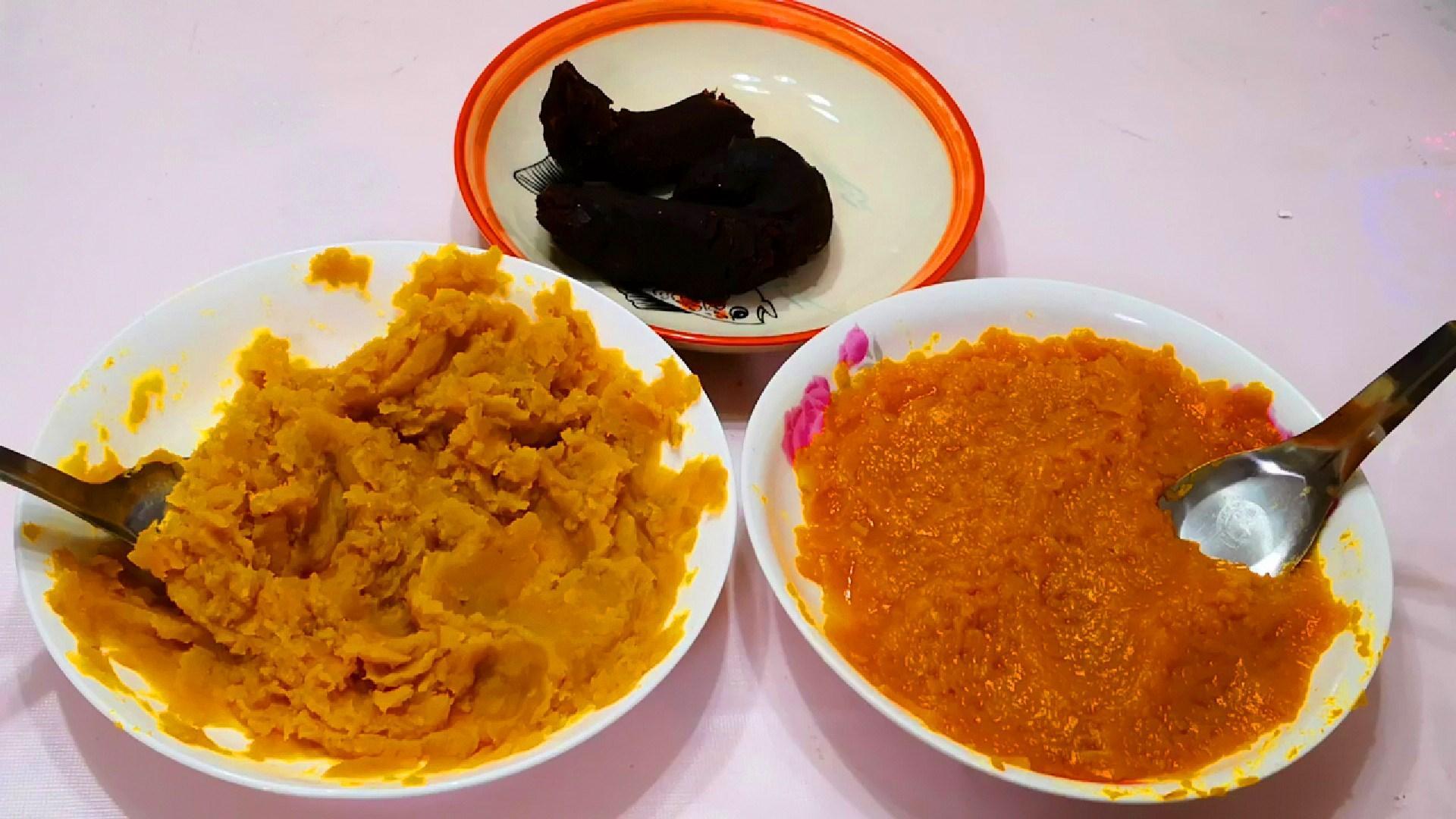 大約需要蒸15分鐘左右可以蒸熟,然後取出後,分別將它們用勺子按壓成泥,再加入適量的白糖攪拌均勻後備用。白糖的量根據自己的口味,喜歡甜口就多加點,不喜歡也可以不加。