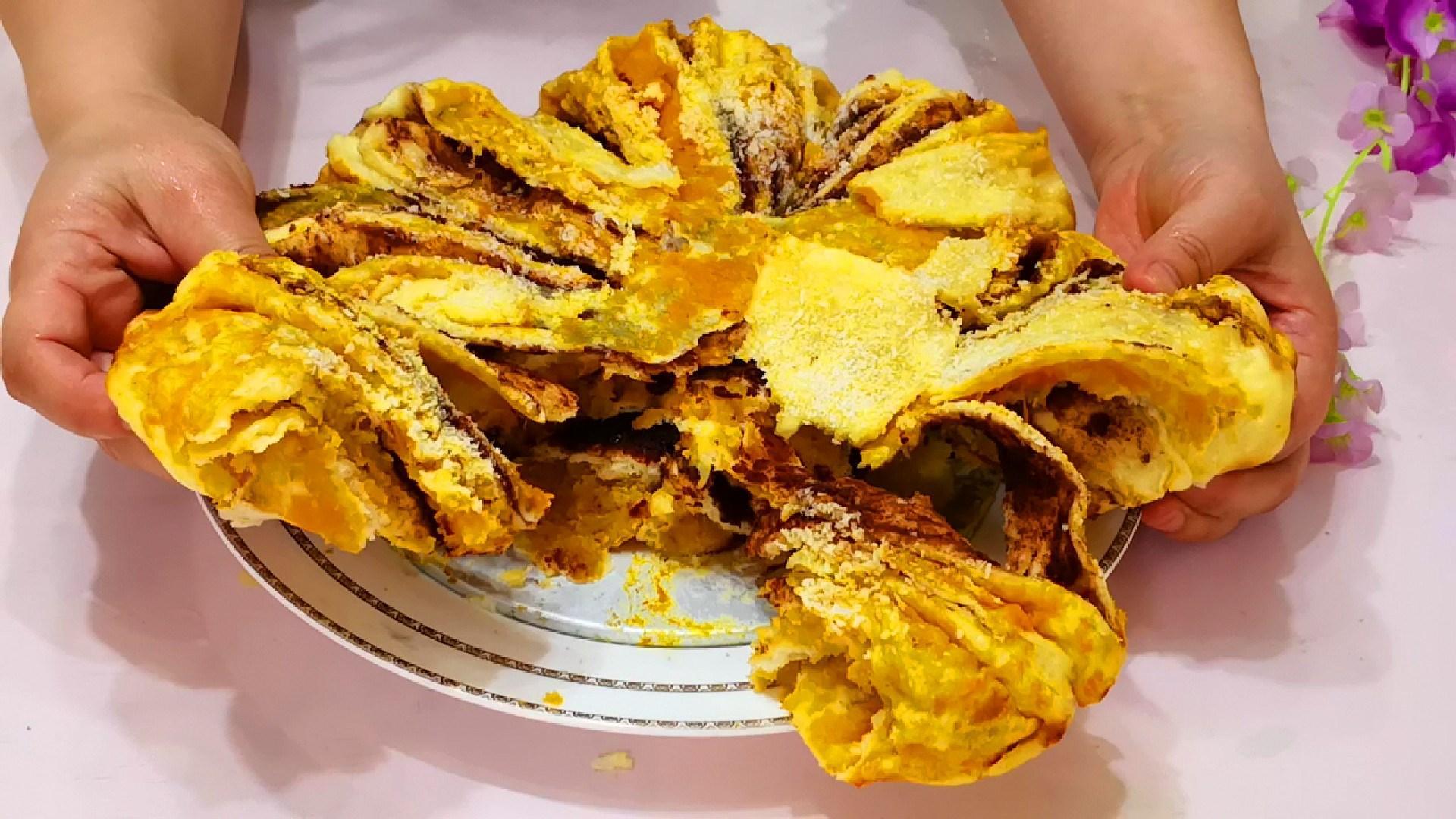 就這樣一層餡料一層餅皮,依次循環着將9張餅皮全都摞上。其中最底下一層需要擀的稍微大出一圈,最上面的一層不要塗抹餡料。用最下面一層的餅皮沿着邊,轉圈將其包裹起來後,再用一個瓶蓋在中間壓一下,然後沿着這瓶蓋印的外圈像切蛋糕一樣,將其分成大小均等的8份。