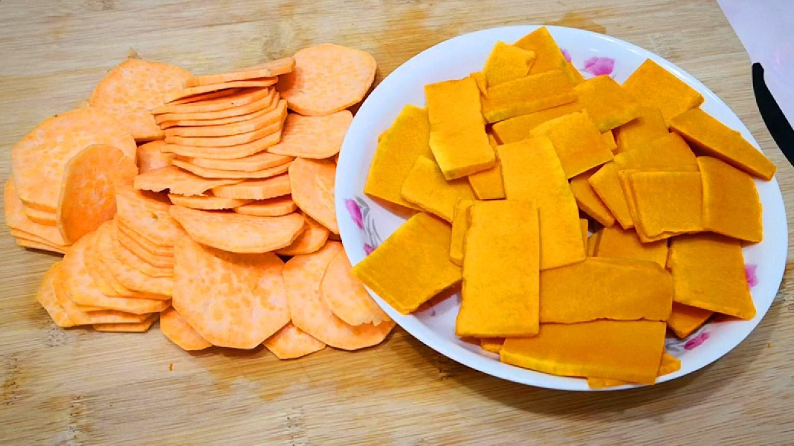 1.先把南瓜削皮洗淨後切成薄片備用;等量的紅薯也削皮後切成厚厚的薄片,將紅薯片和南瓜片單獨裝盤放入蒸鍋中蒸熟。