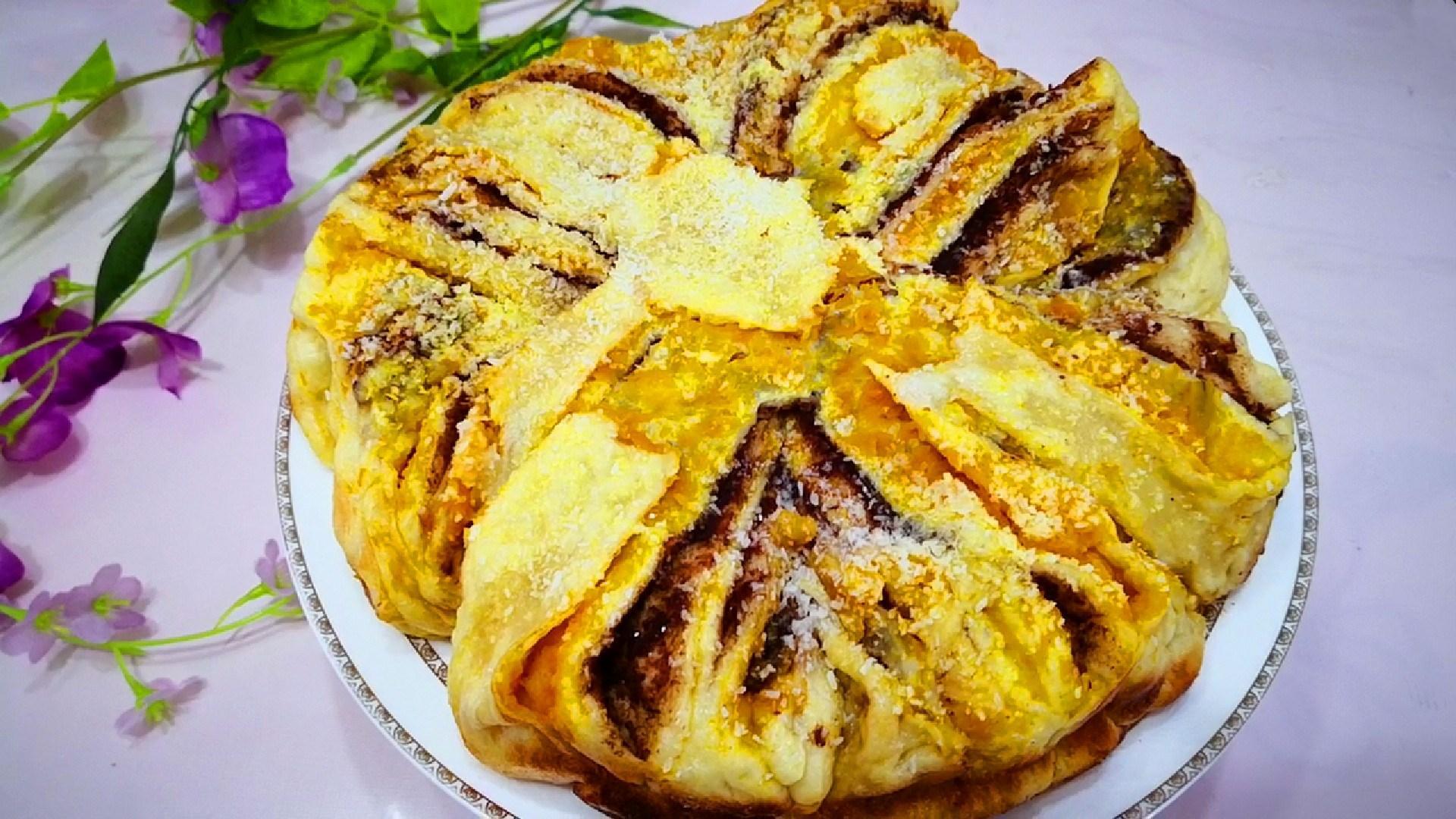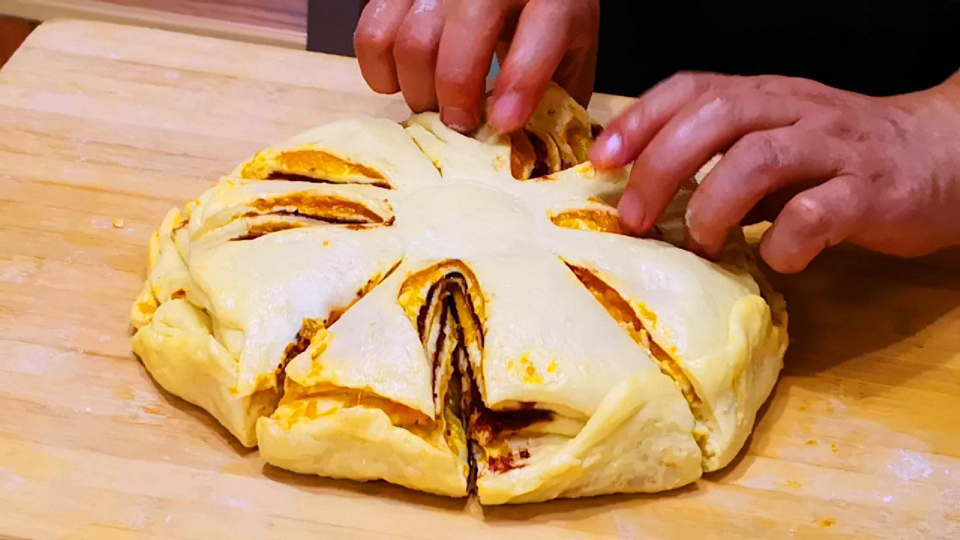 接着用兩隻手分別抓住其中的兩份,向兩邊翻轉,讓中間的餡料全都露出來,形成一個漂亮的花朵的樣子,接着再上面均勻地刷上一層蛋黃液,撒上一層椰蓉,放到一邊蓋上保鮮膜,二次醒發15分鐘左右。