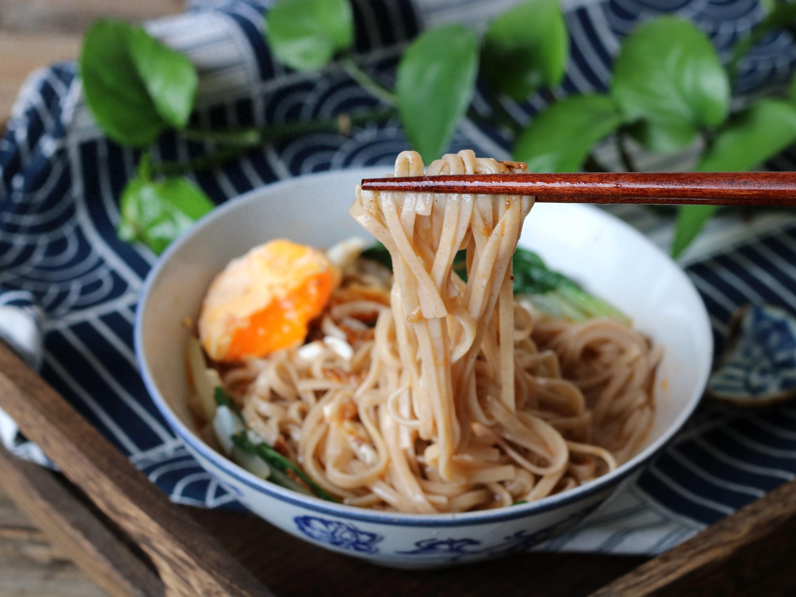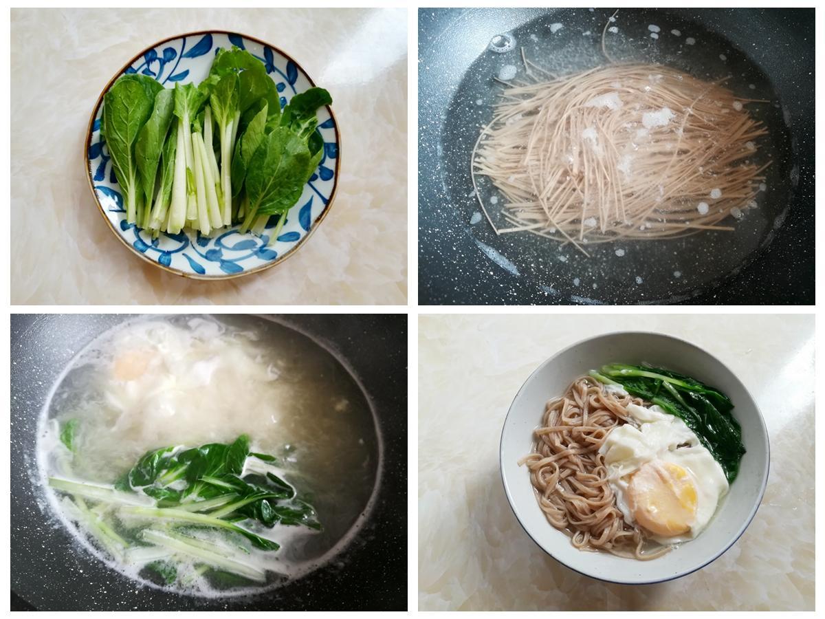 食材:蕎麥麪條、雞蛋、青菜、鹽、拌麪醬