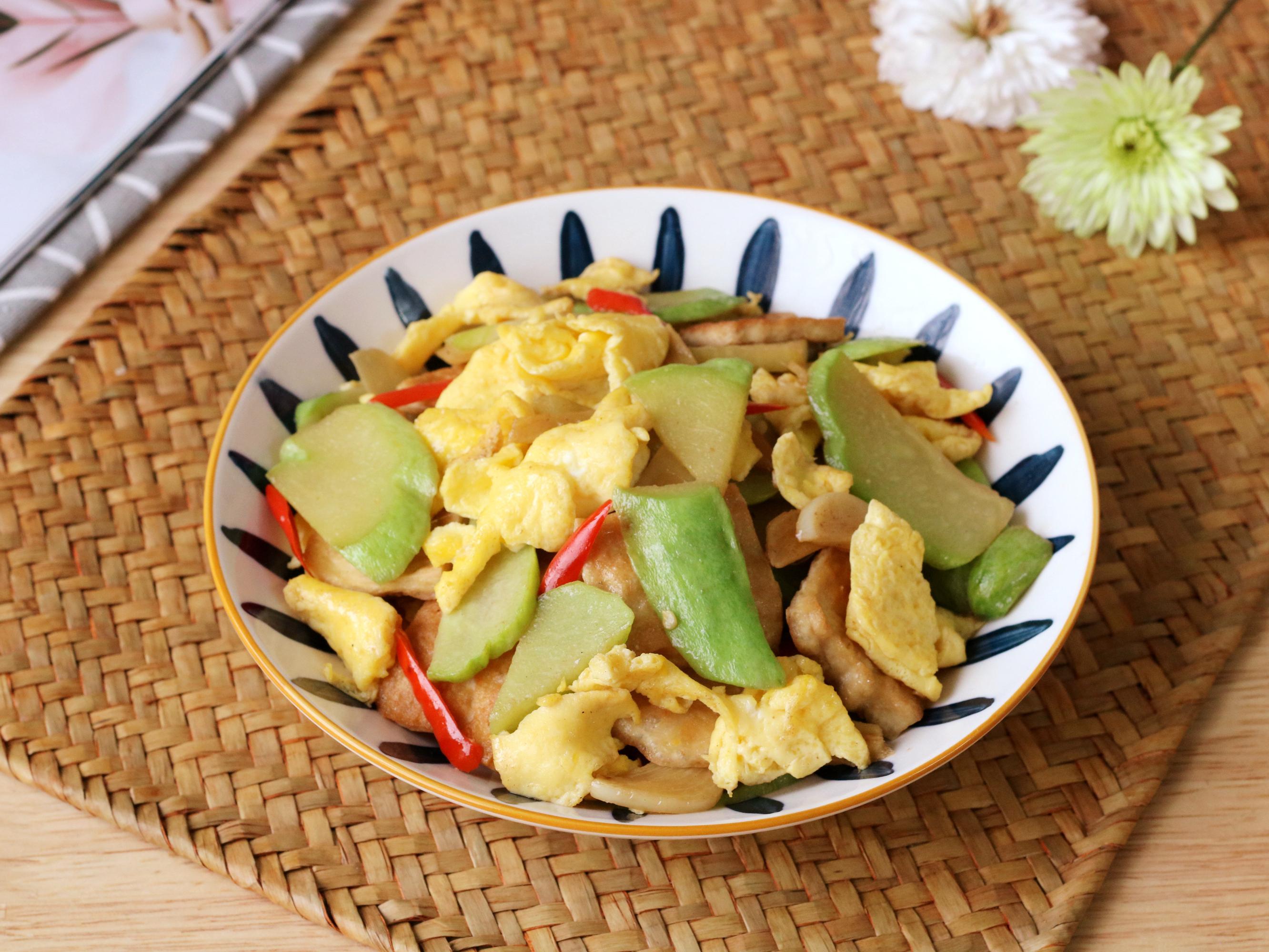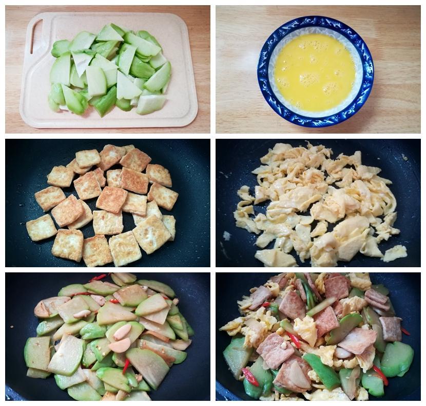 食材:佛手瓜、雞蛋、豆腐、辣椒、大蒜、生薑、食用油、鹽