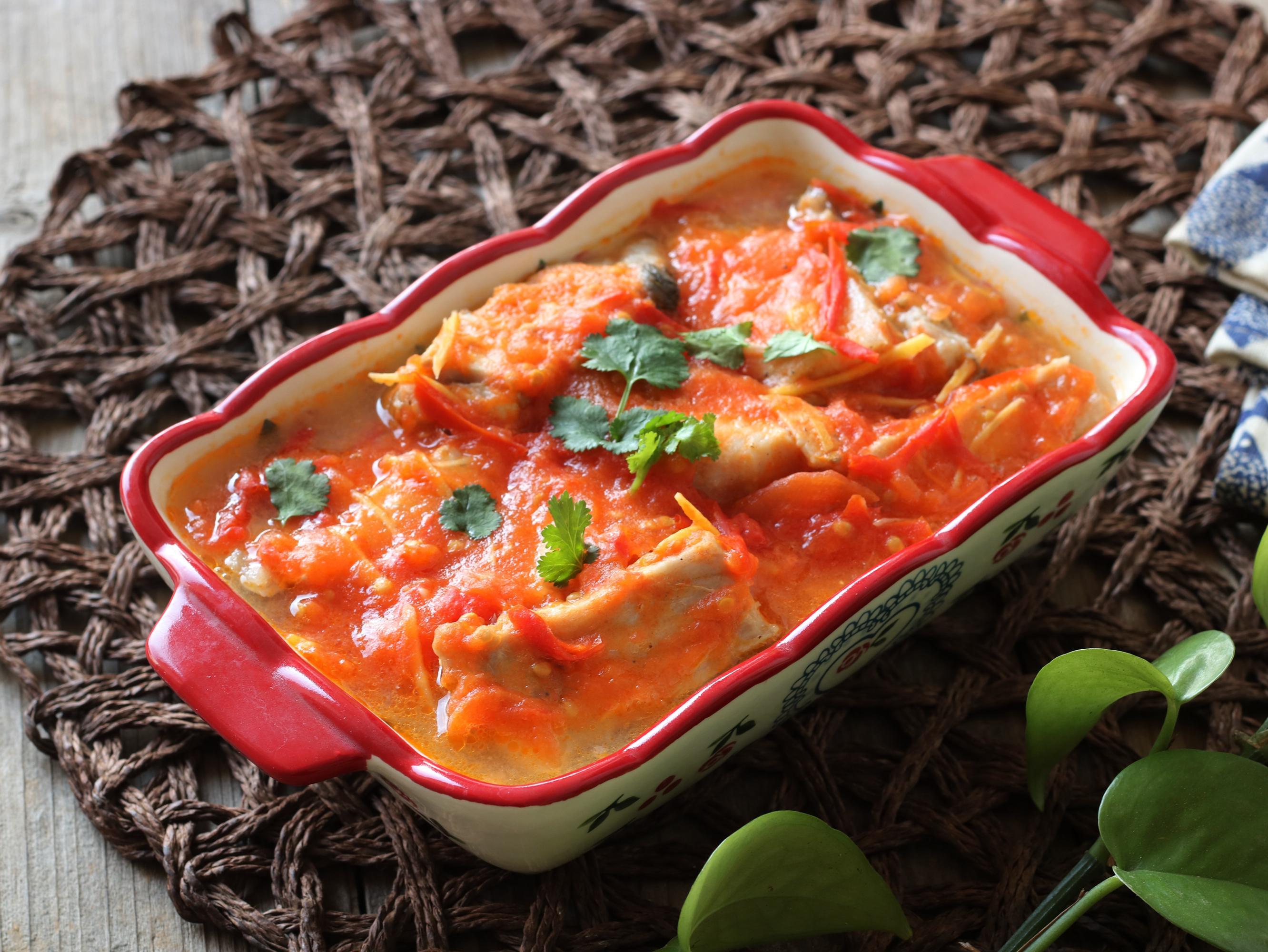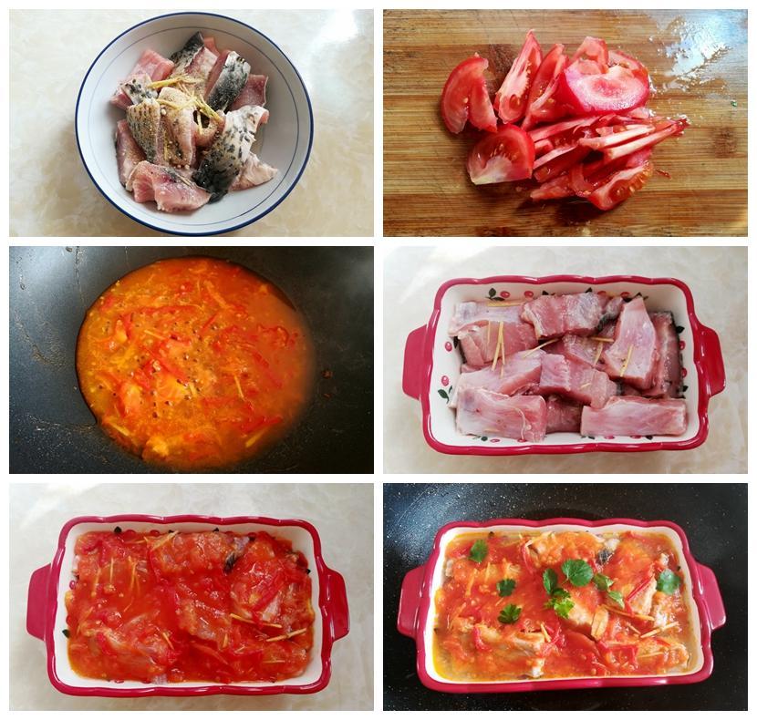 3,醃好的魚塊放到長的盤子裏,鋪上炒好的茄汁,放到燒開水的鍋裏,大火隔水蒸10分鐘,出鍋前撒上香菜。