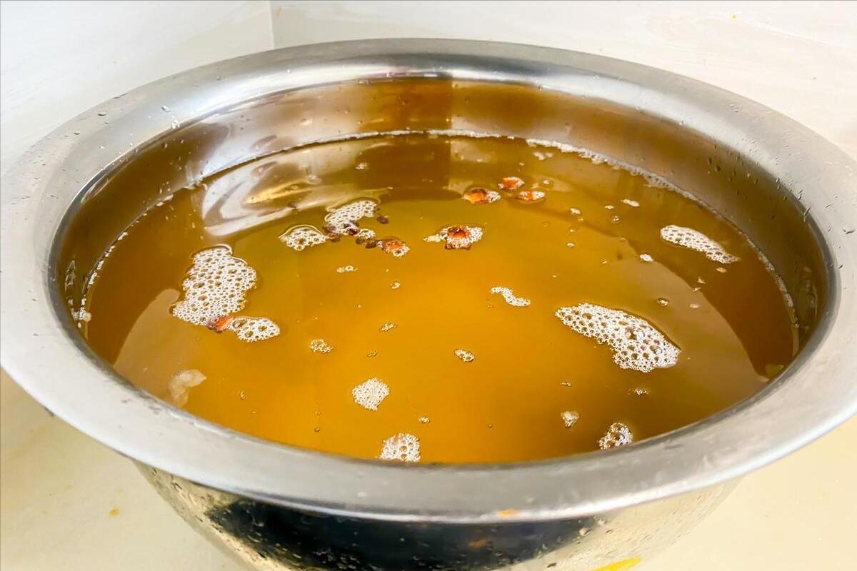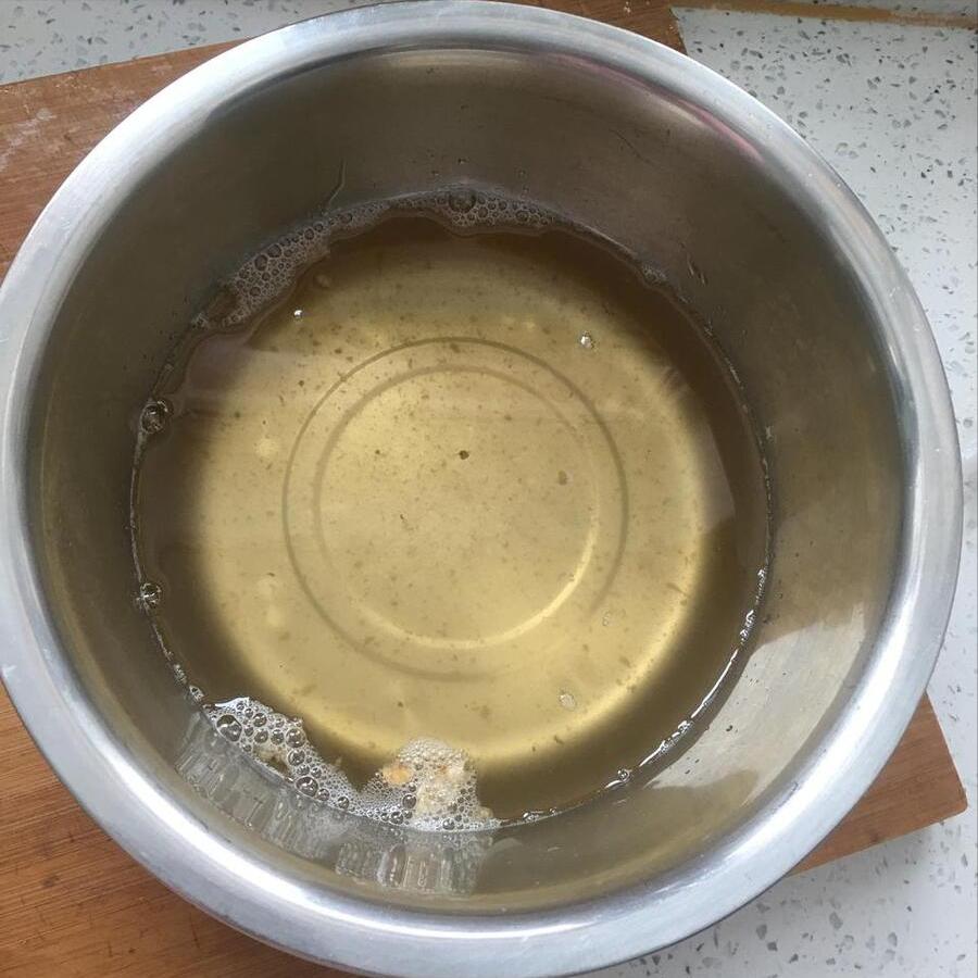 5、熬製一段時間,等到豬板油的顏色變成黃色,等到豬板油的狀態變成小小的、乾乾的,那就說明豬板油已經被熬幹了,裏面的油分基本上都熬出來了,這個時候咱們把豬板油,現在變成豬油渣了,撈出來扔掉。