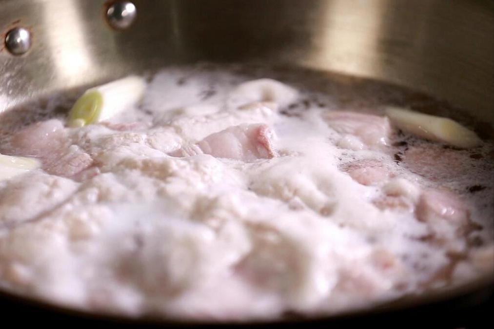 2、買來以後,要放在水中稍微沖洗幾遍,把上面的髒東西洗掉以後,再放到案板上切成小丁。接下來我們準備一鍋水,等水燒開之後,把豬板油倒進去焯水,煮出多餘的浮沫以後,把這些髒東西撇掉,然後將豬板油撈出來。