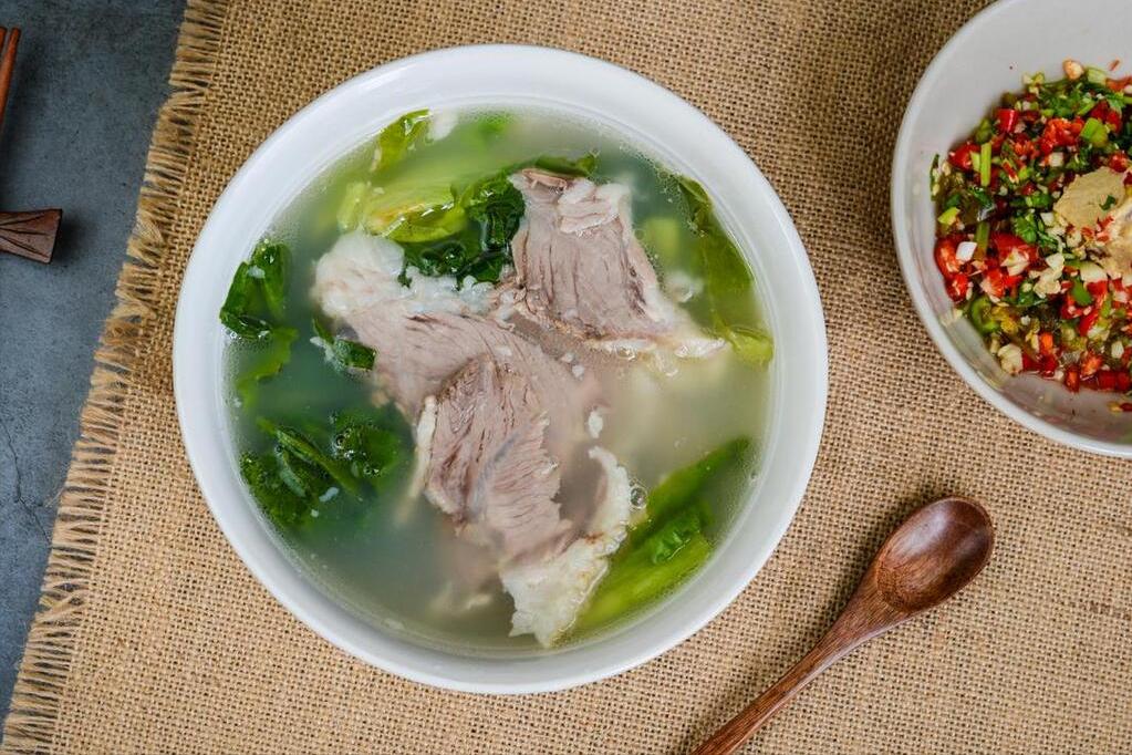 2、接下來我們往裏面倒入切好的蔥段、薑片,然後往裏面添上清水,再來點料酒去腥。接下來保持大火將其燒開,用勺子把飄在上面的浮沫撇乾淨,隨後改爲小火,繼續燉上1個小時的時間,燉好後放入鹽、白胡椒粉調味,盛出來加上少許辣椒油,開喝!