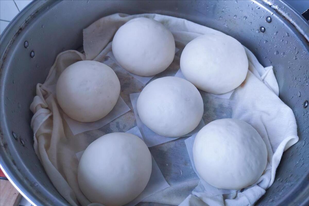 6、然後再把麪糰整理成一個個的饅頭,隨後準備好鍋子,往鍋子裏添上適量的溫水,接下來把蒸籠放上去,將饅頭放進去,這個時候不要直接來蒸,一定要蓋上蓋子,將麪糰二次發酵一下,發酵20分鐘,整體體積變得更大了,這樣蒸出來更加蓬鬆、暄軟,這是第3個妙招。