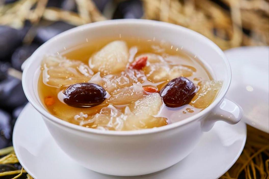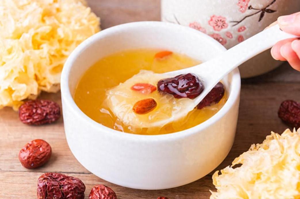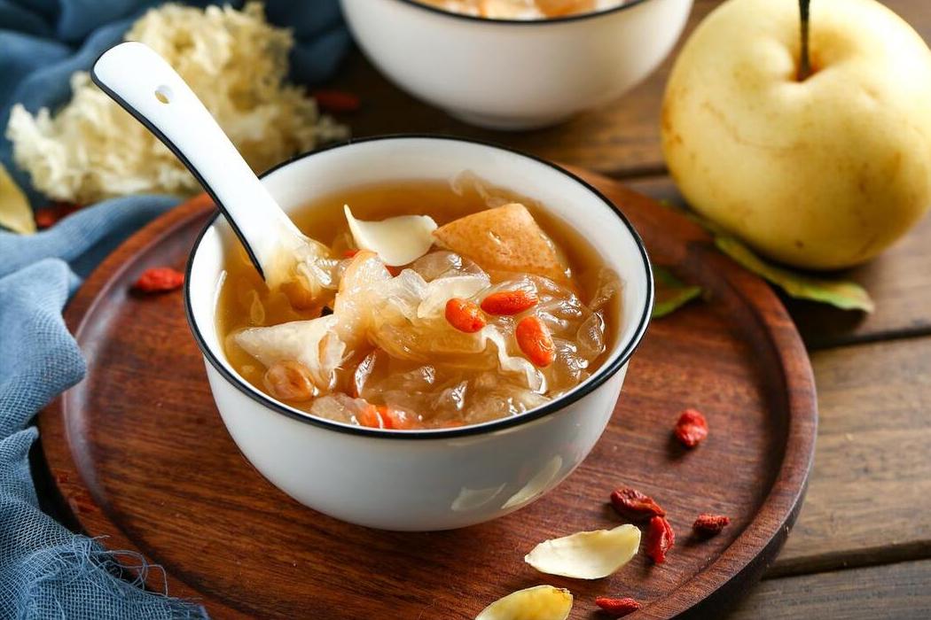銀耳泡發好以後,撕碎倒在鍋子裏,然後加入清水,保持大火燉上20分鐘。趁此時間,我們將雪梨洗淨切一下,紅棗、枸杞洗淨,等銀耳湯煮好後,將雪梨、紅棗放進去,再燉半個小時左右,最後加入枸杞和冰糖調味,出鍋開喝。
