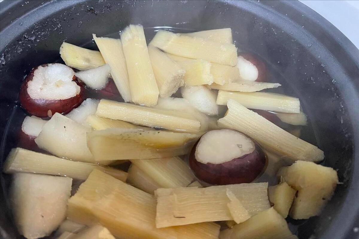 甘蔗去皮後,切成小段,馬蹄稍微清洗一下,然後把外皮削掉,接下來將甘蔗和馬蹄都倒在鍋子裏,然後往裏面添上適量的清水,大火燒開之後,繼續煮上半個小時左右,最後放上幾塊冰糖,攪拌至融化後,出鍋開喝。