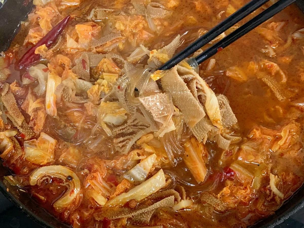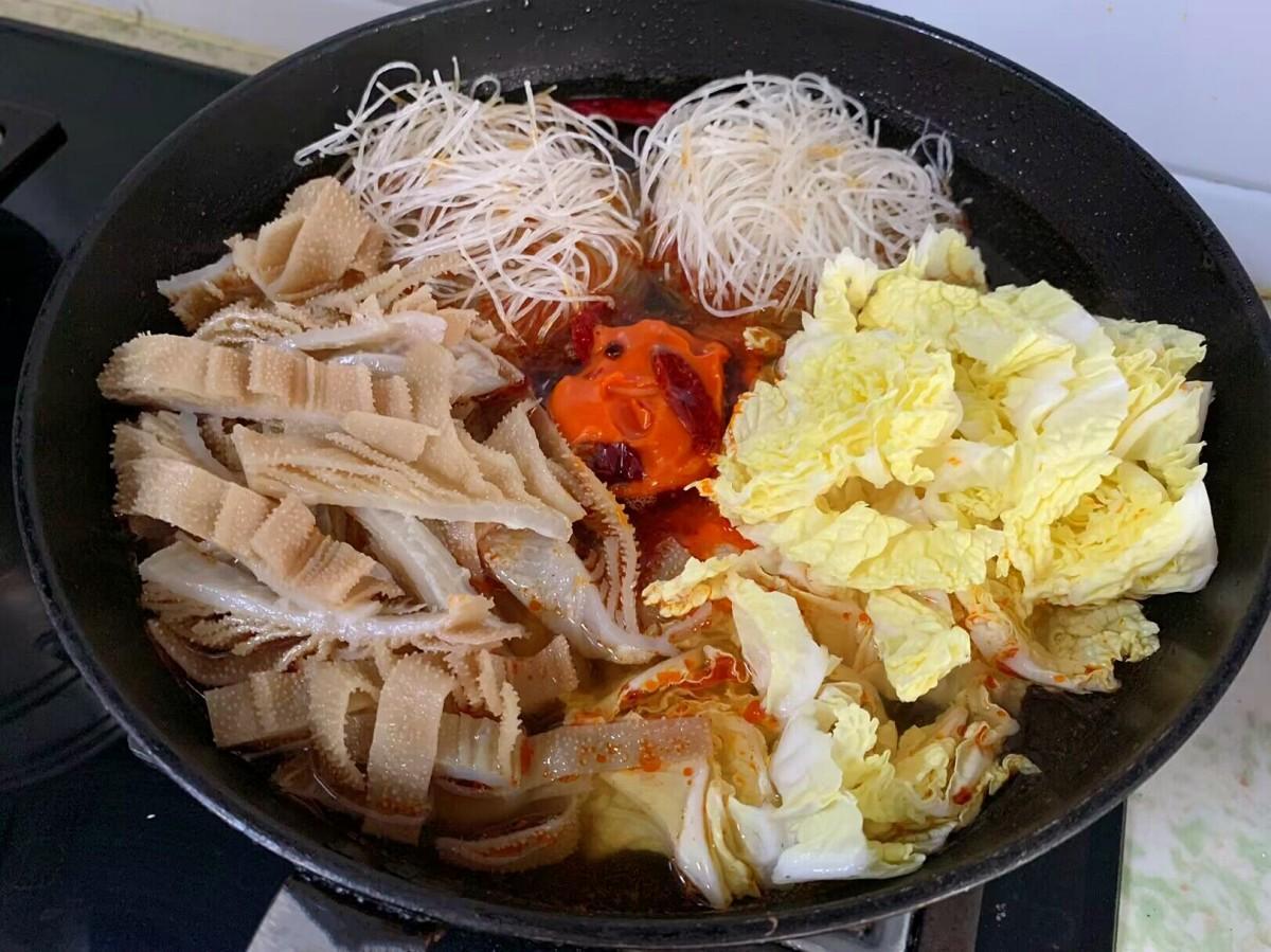 2、除了牛百葉我還準備了白菜和龍口粉絲,因爲主要是喫牛百葉,所以配菜就少了點,大家的配菜可以根據自己的口味多準備幾樣,任意添加。把所有食材一塊下進去,再加入生抽 、蠔油、食鹽和白糖調味,大火燒開後再燉5分鐘就可以關火開喫了。這就是我家低配版的火鍋,雖然操作簡單,食材種類也少,但是絲毫不影響麻辣鮮香的口感,喫起來太過癮了。