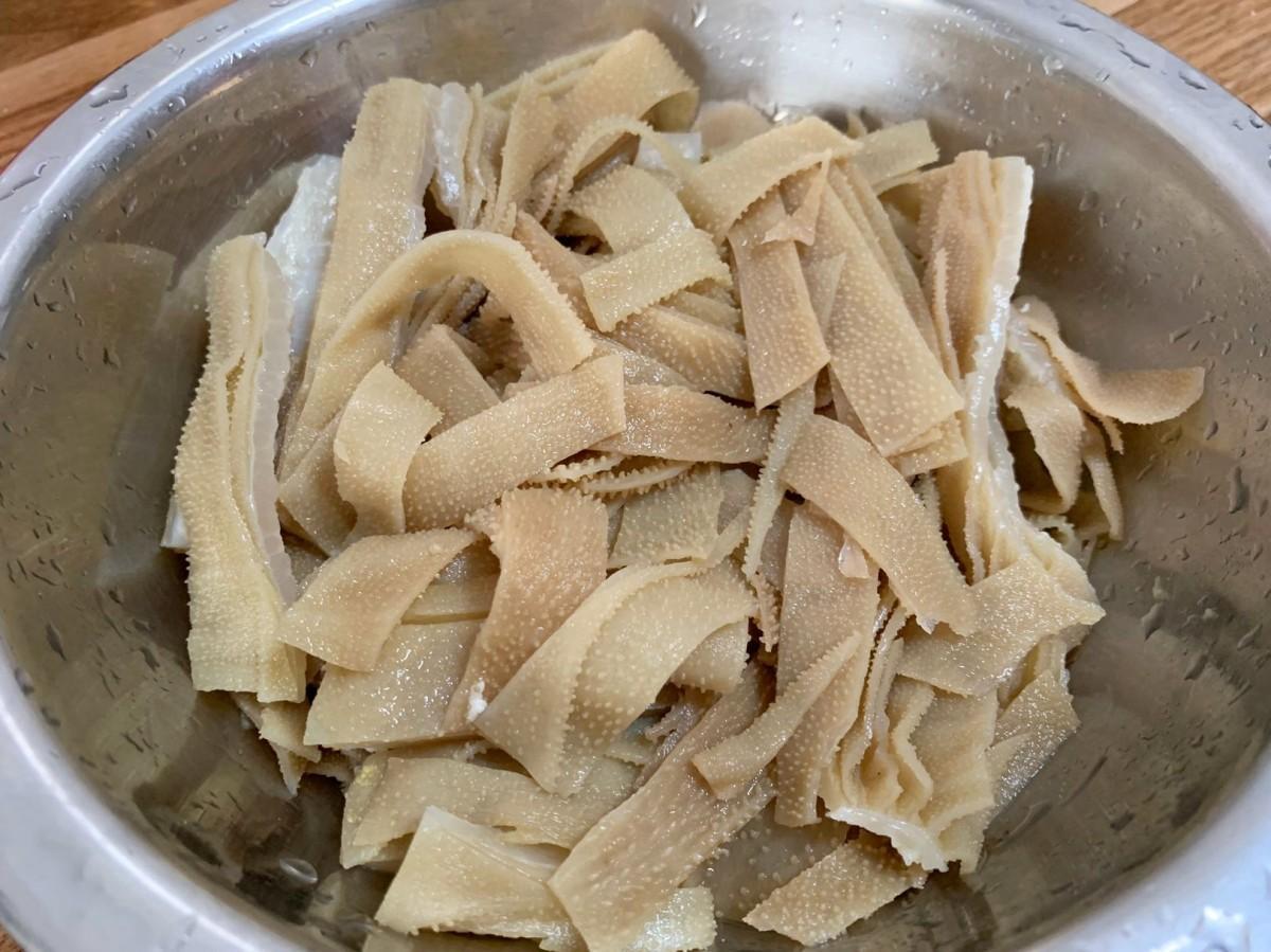 買回來的牛百葉清洗的時候要一片片翻開,以防縫隙藏污。先用清水沖洗一遍,如果還不放心的話,沖洗的同時用乾淨的牙刷刷洗一遍,再清洗乾淨。之後把牛百葉改刀切成均勻的長條,然後放入食鹽搓洗幾分鐘,去除異味,再衝洗乾淨就可以了。下面就準備開火了,大家一起來看看我是怎麼做的吧。