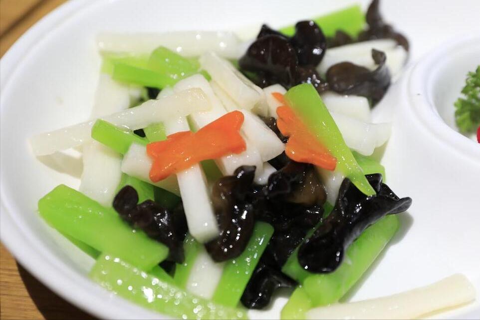 食材:山藥、木耳、西芹、蔥花、鹽、雞精、食用油