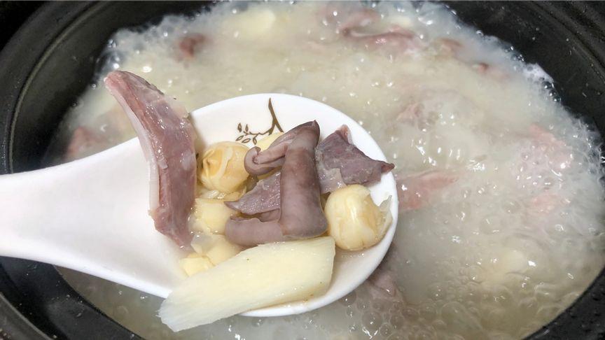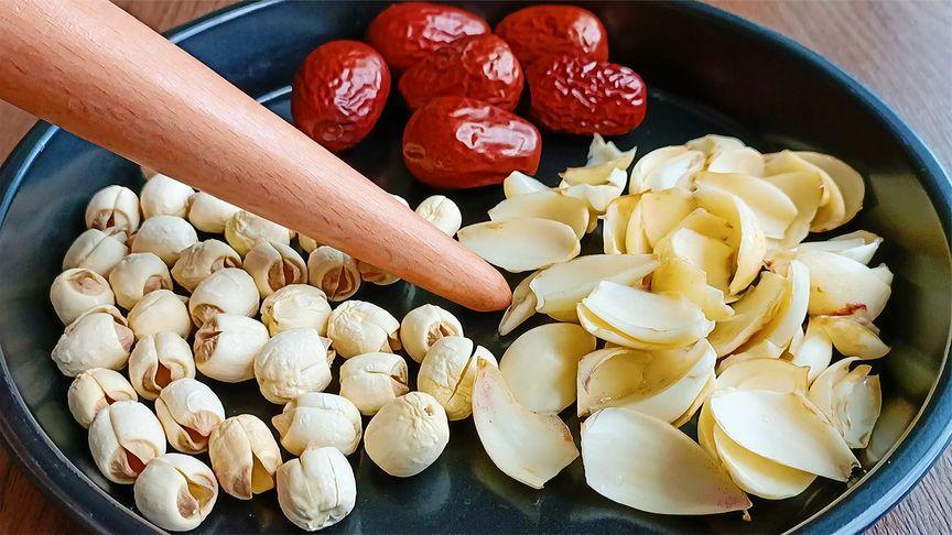 2、要想湯足夠白一定要加開水。再放紅棗、黨蔘、蓮子,扣蓋煮 45 分鐘。出鍋前加鹽、枸杞、蔥花。