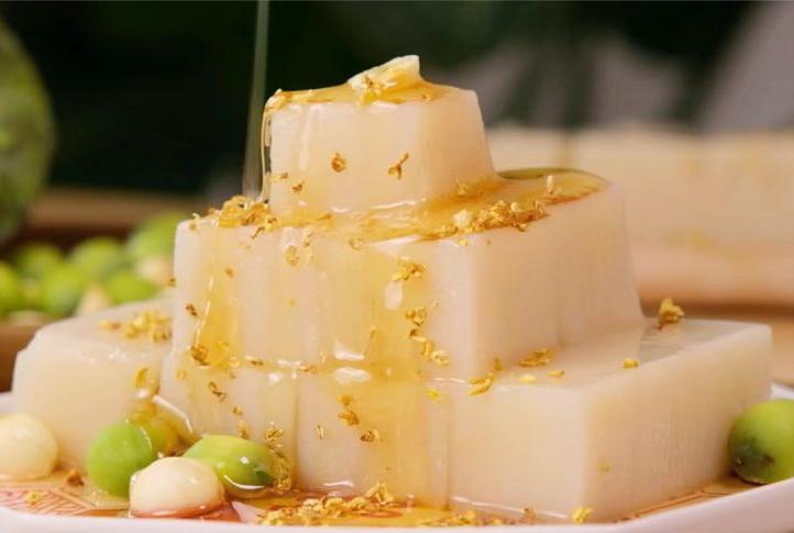2、把打好的蓮子糊倒入鍋中,加入冰糖,小火煮化,撇去表面浮沫。關火後倒入白涼粉,攪拌均勻後倒入容器中,靜置到室溫後,轉移到冰箱冷藏,冷藏 2 小時以上至定型。拿出後脫模切塊,淋上蜂蜜、撒上幹桂花即可。