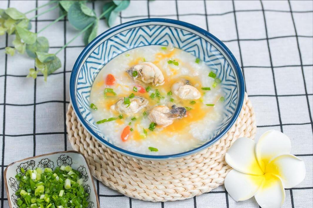 用到:大蝦、扇貝、豌豆、蔥花、生薑、大米、鹽、味精、白胡椒粉