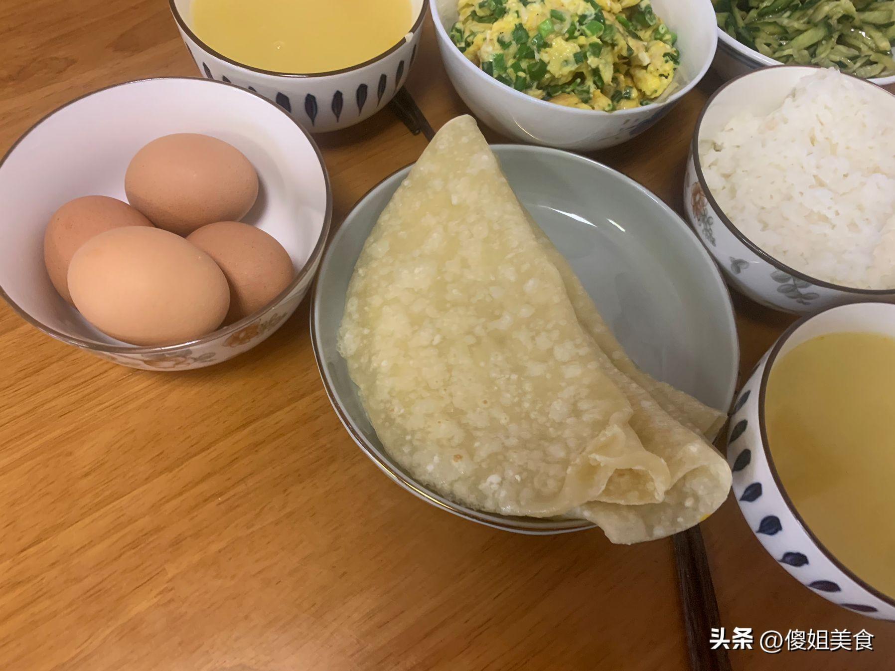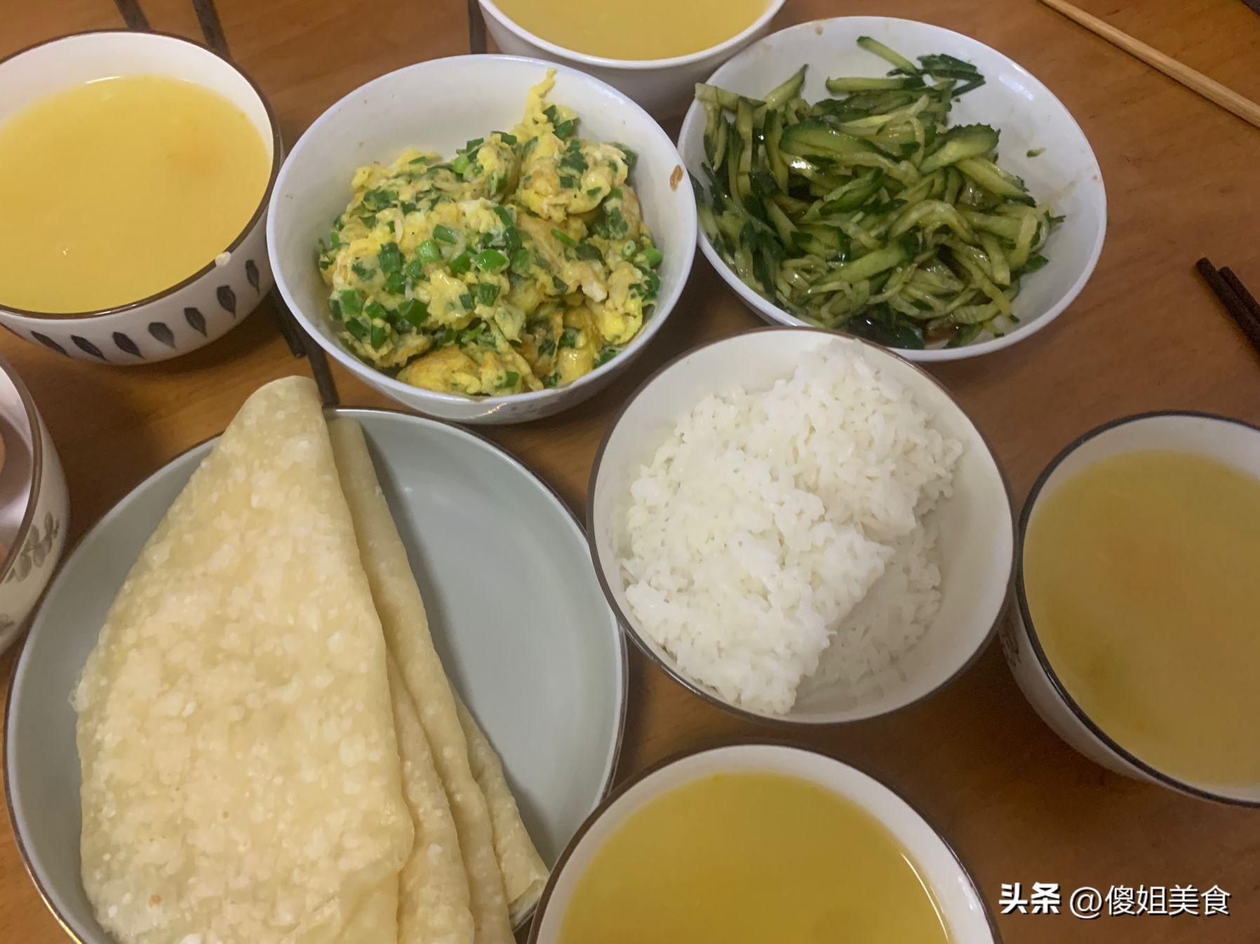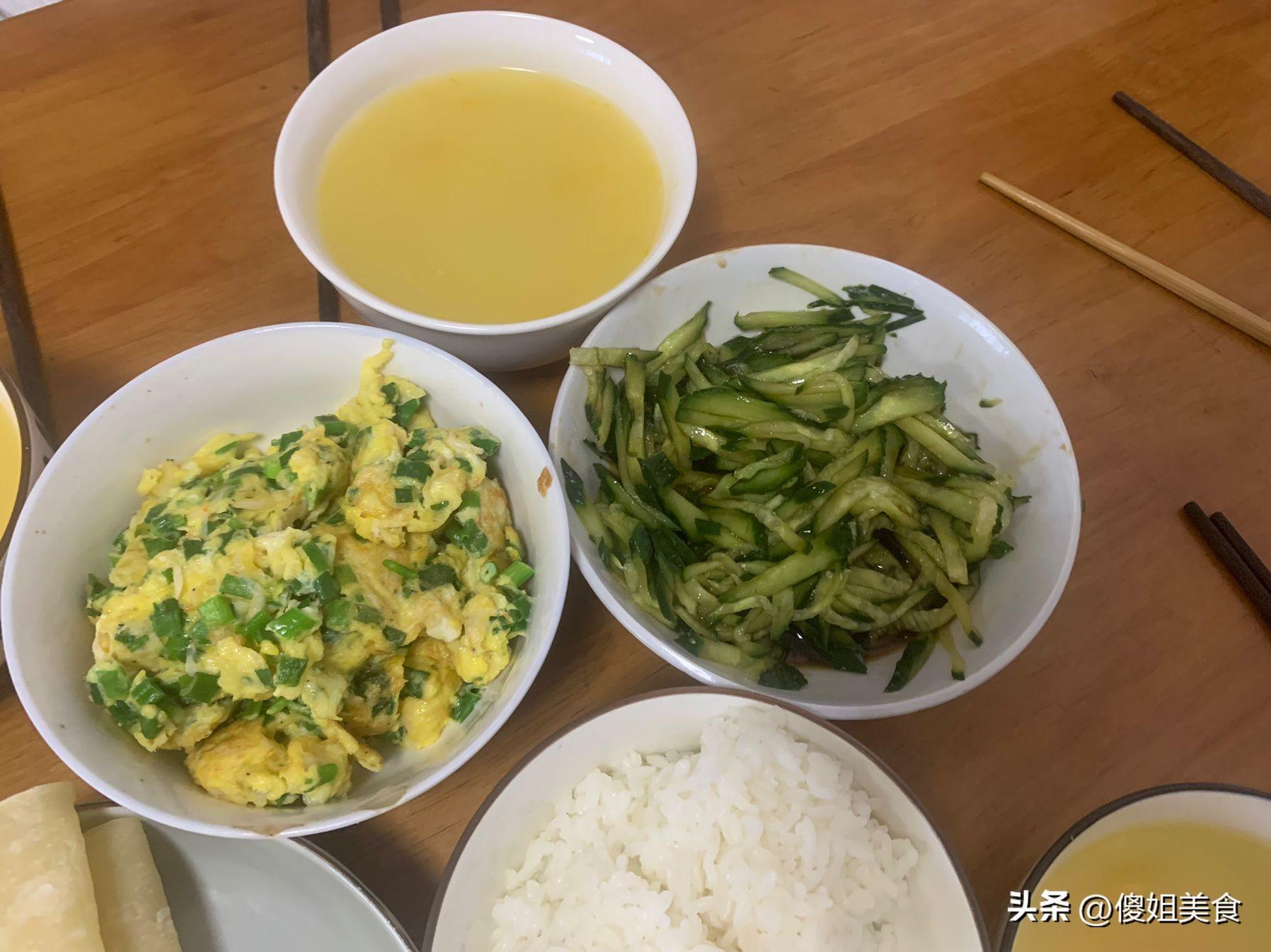 婆婆知道我不愛喫白水煮蛋,每天早上總會給我炒幾個雞蛋喫,這次是雞蛋和韭菜炒在一起的,鮮香美味,用小餅裹着韭菜炒雞蛋和黃瓜絲喫一口賊過癮,我一口吃了3張小餅,婆婆每次把剩菜都是留給自己喫。看了吧早上又把昨天晚上剩的米飯給喫了,生怕丟掉可惜。簡單好喫的早餐看着就好喫,每喫一口都是婆婆對我的愛,簡直是太幸福了!