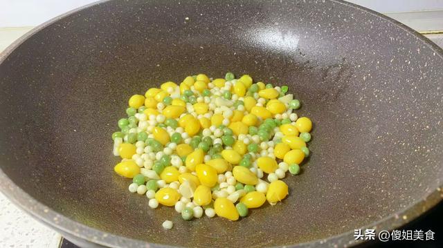 3、鍋中加入適量食用油,待油熱後放入白果翻炒,炒至白果表面微微變黃,加入焯過水的雞頭米和豌豆,繼續翻炒2-3分鐘,期間加入適量鹽調味,翻炒均勻入味即可。
