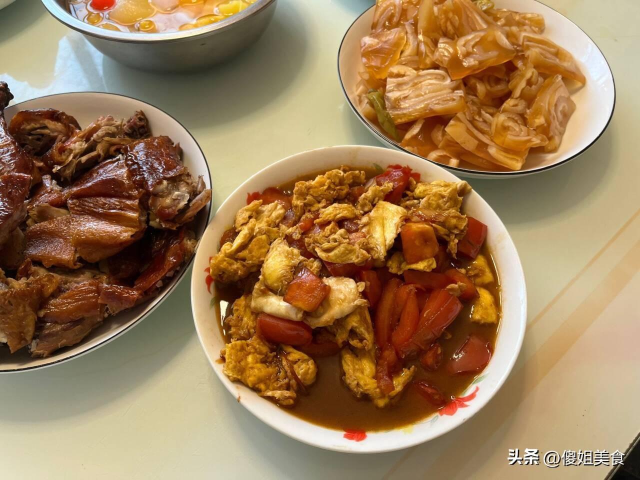 也不知道搭配啥青菜,就隨手炒了個西紅柿雞蛋,這道菜正好孩子們喜歡喫。炒西紅柿的時候放點白糖,炒出來的西紅柿酸甜可口,好喫又下飯。