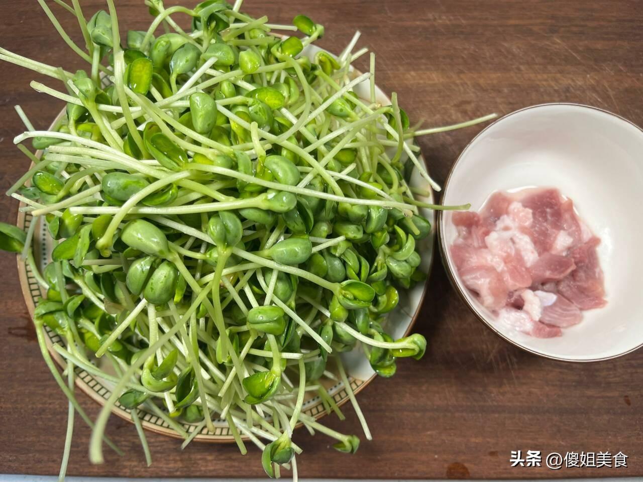 1、新鮮的青豆苗買回來的時候還帶有根,用刀把根切掉,然後放入清水中多淘洗幾遍,清洗乾淨後放入開水鍋中焯一下水,焯水可以除去異味,還能使青豆苗更翠綠,口感好喫。起鍋燒油先把五花肉放進去煸炒一下,隨後再放入蔥花炒出蔥香味。最後把青豆苗放進去不停的翻炒,淋入少許味極鮮、雞精、蠔油和鹽翻炒調味。