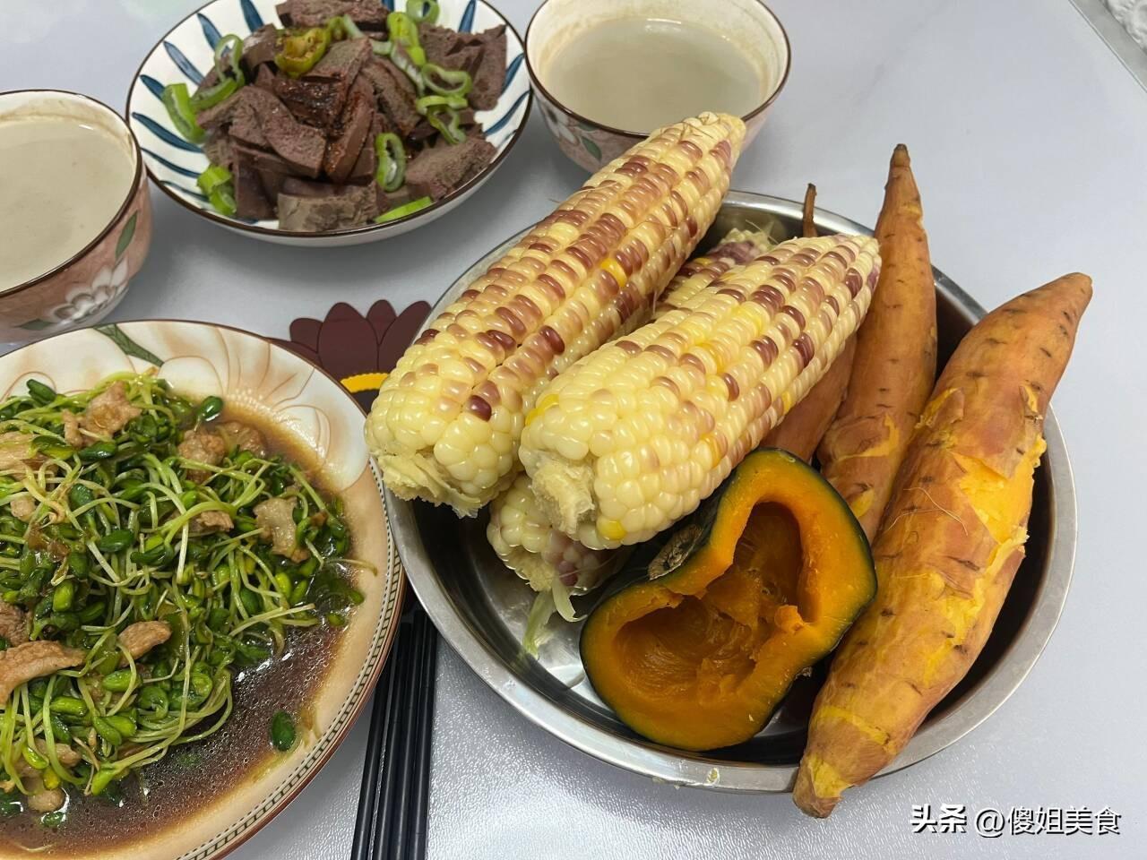 家裏沒有饅頭,我就在電鍋上煮的玉米、蒸的南瓜和地瓜,這個季節正是南瓜、地瓜大量上市的季節特別的便宜。南瓜和地瓜是俺家老婆婆自己種的,上次回家時帶來的,一直沒有喫,正好晚上蒸了下,軟糯香甜很好喫。搭配老公做的兩道家常菜,這頓晚飯喫的飽飽的,還是家裏的飯好喫,喫到最後一點都沒剩,喫光了。