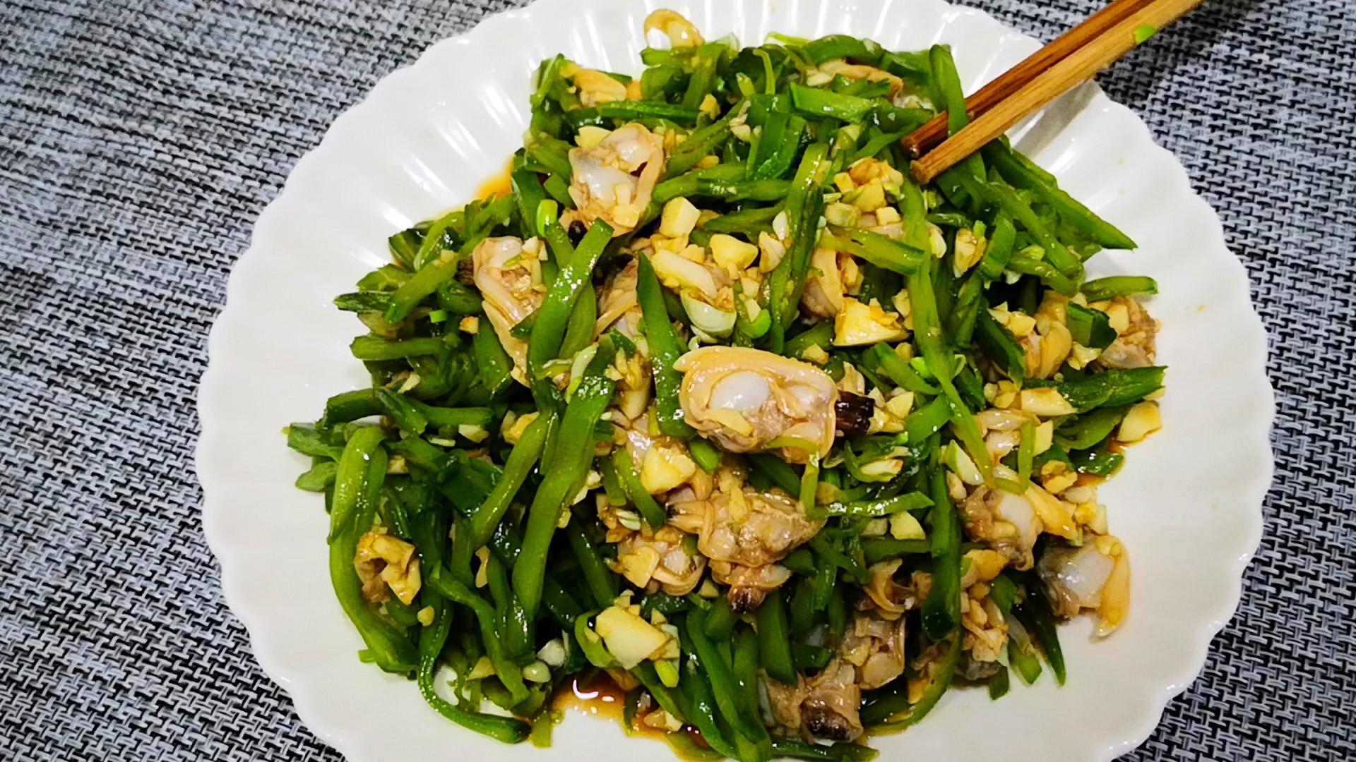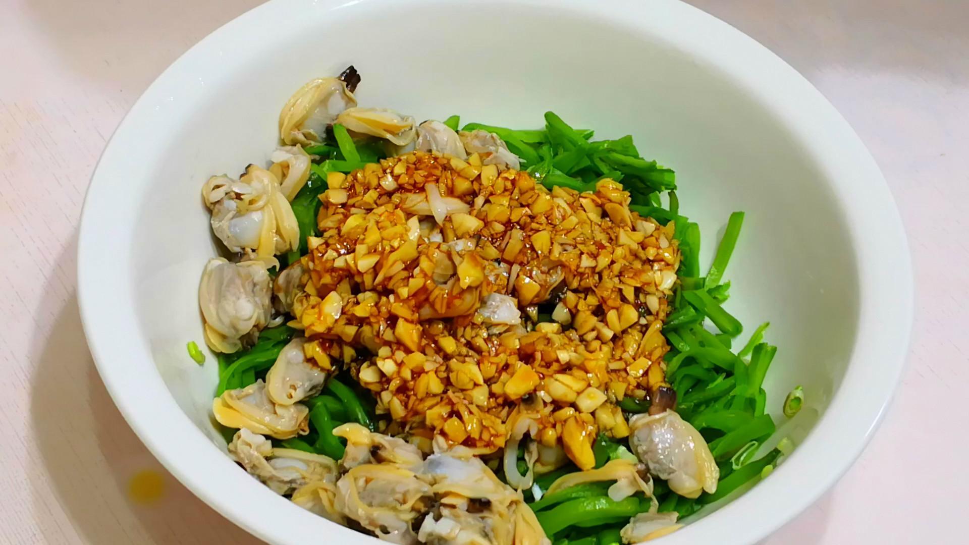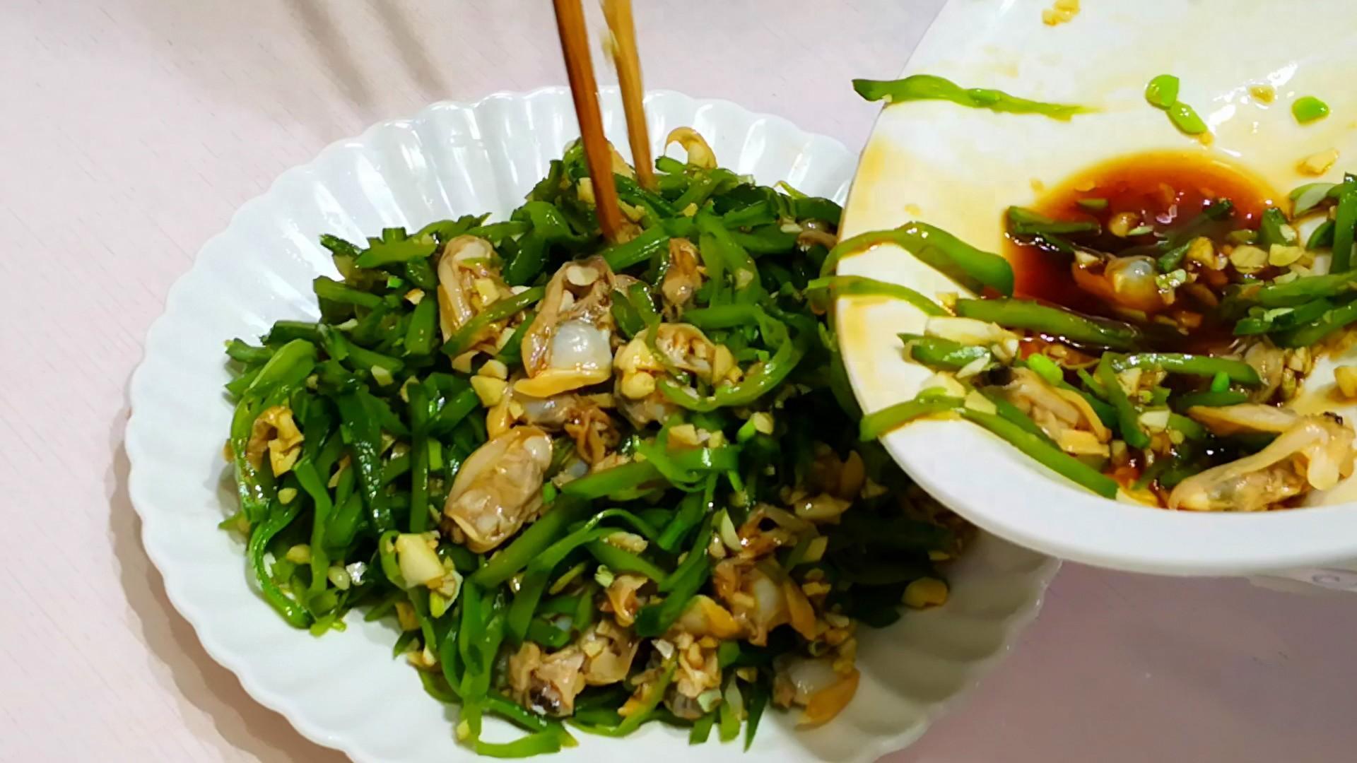 5.最後將花蛤肉和煮熟的梅豆絲放到一起,再倒上調好的涼拌汁,攪拌均勻後裝入盤中,就可以端上桌開喫了,鮮美極了!