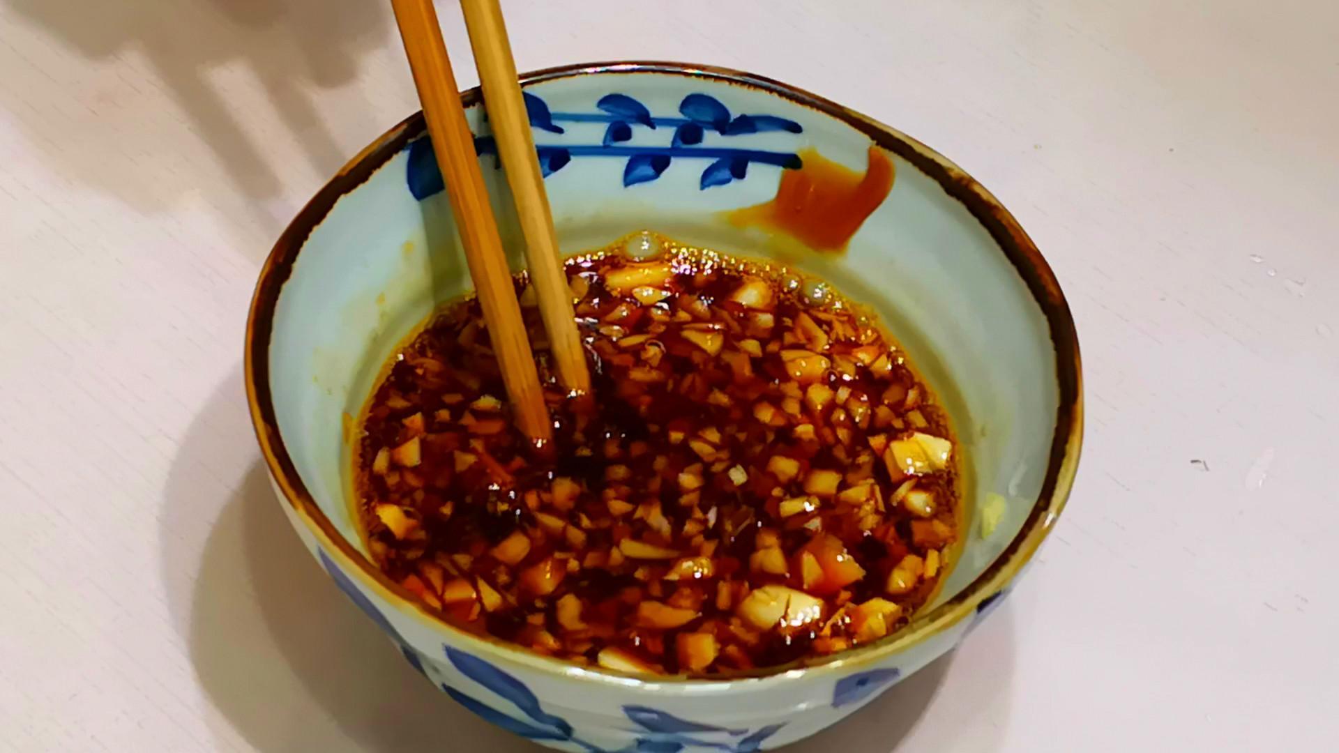 4.再來調個涼拌汁:大蒜剁細放入碗中,然後加入適量的生抽、蠔油、米醋和白糖,攪拌均勻即可。