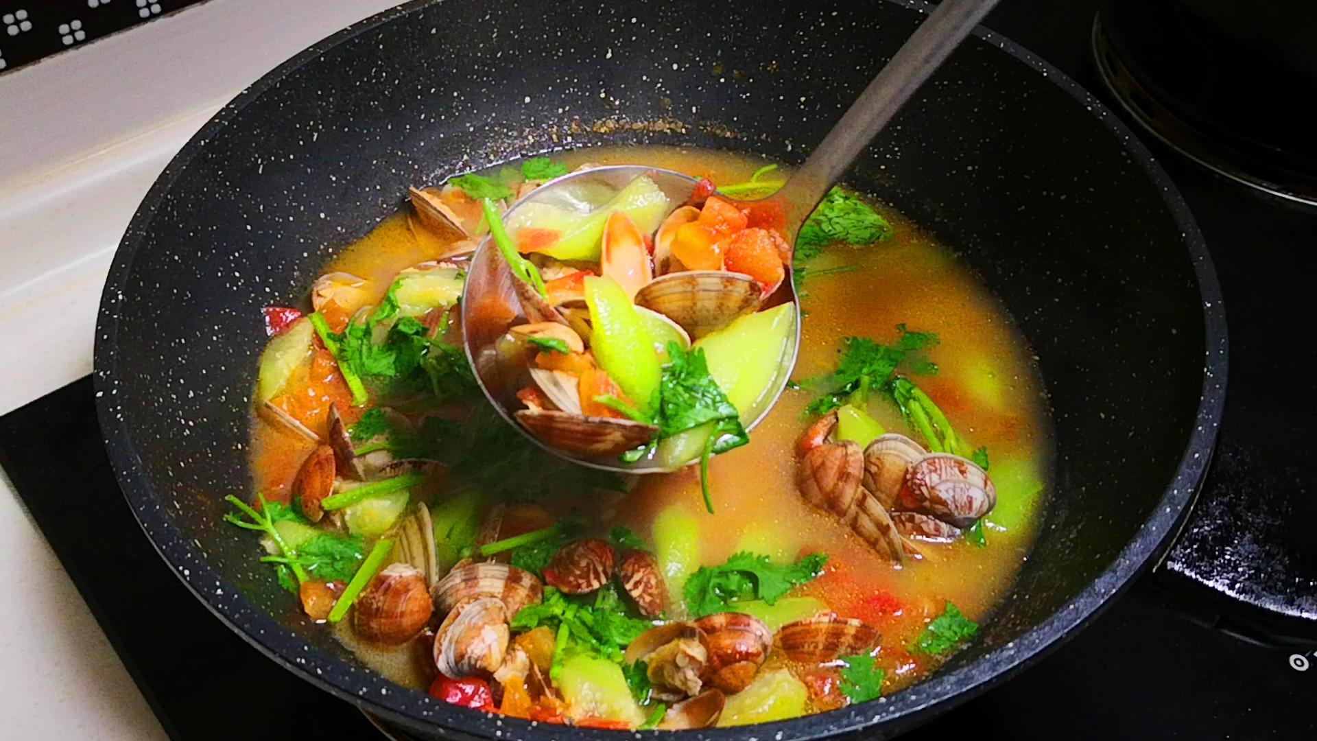 3.大約煮3~5分鐘,看到花蛤全都張嘴後開鍋,然後開始調味,加入適量的食鹽、胡椒粉和香油,攪拌均勻後,再撒上一點香菜段提鮮,美味即成!