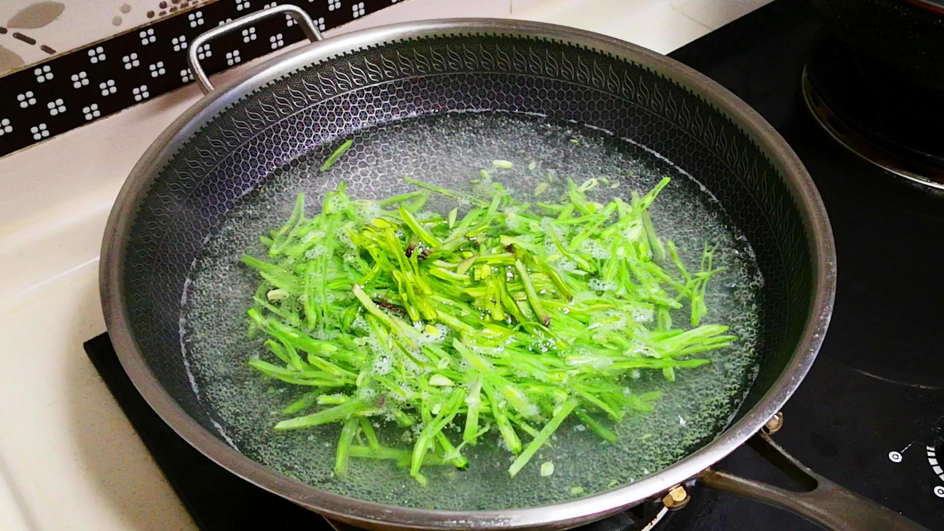 3.再燒上一鍋開水,水開後先把梅豆絲放入,煮3~5分鐘左右,將梅豆絲完全煮熟後控出,放到涼水中過涼,再控水備用。(這一步一定要保證梅豆絲完全熟透,否則可能會中毒)