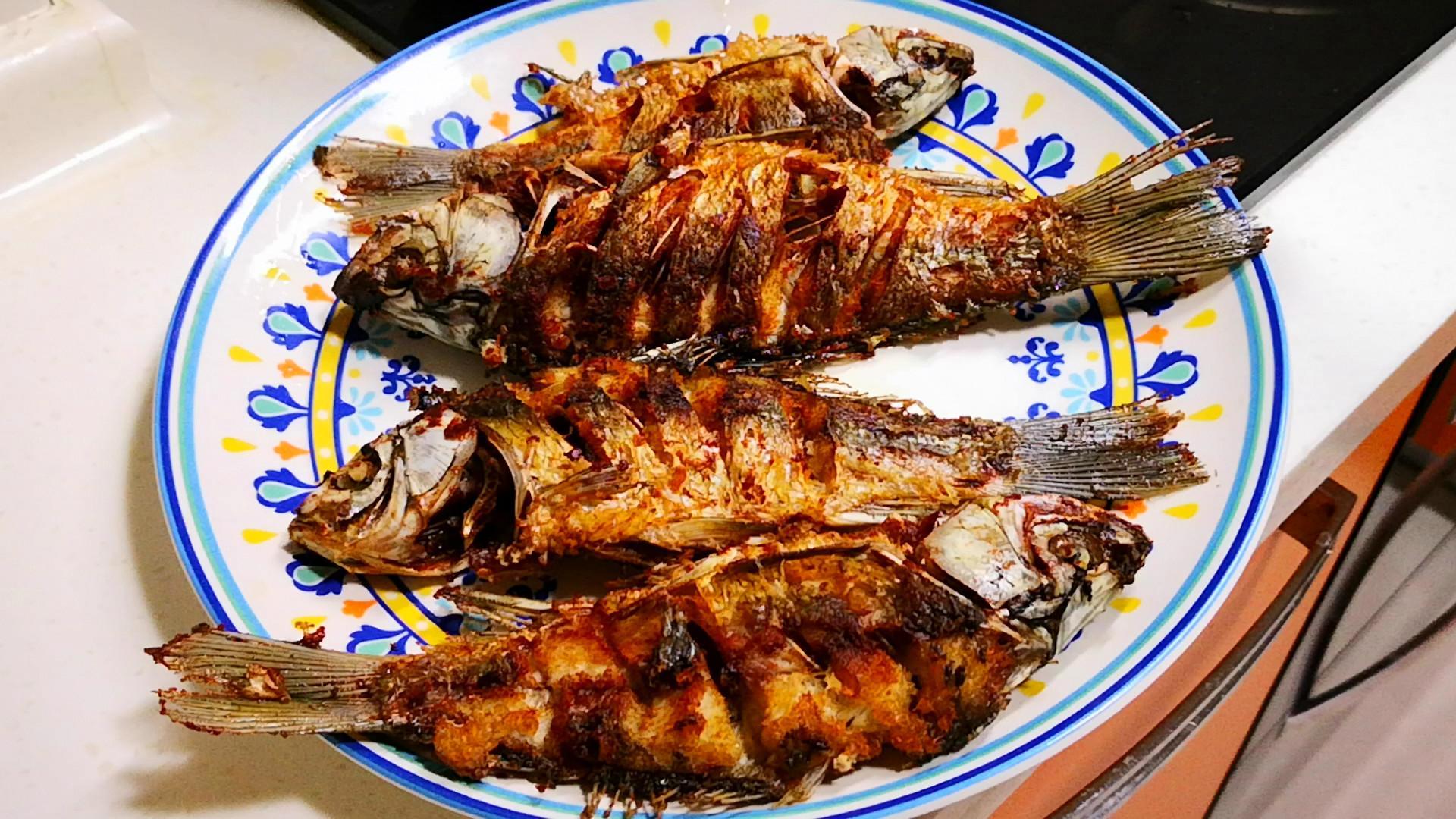 熱鍋加多一點的油,油溫5~6成熱時,將鯽魚下入鍋中,把火調成中火慢慢炸制,待魚肉定型後,再輕輕翻動魚,讓其正反兩面受熱均勻,大約炸6分鐘左右後再改成小火繼續炸3分鐘左右,把魚肉和魚骨全都炸酥後,再控油撈出放入盤中備用。
