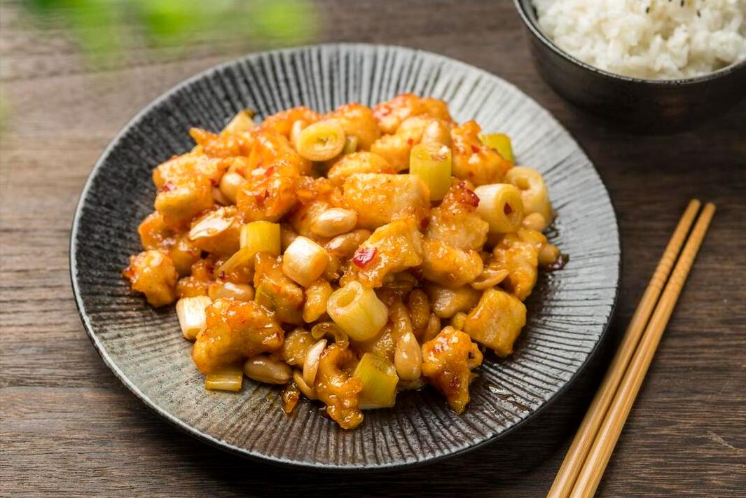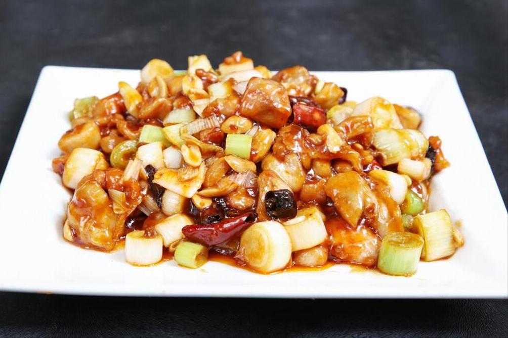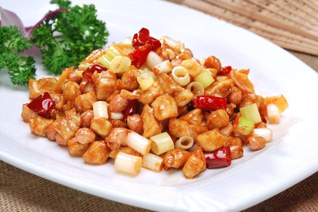 2、重新起油鍋,爆香蔥薑蒜、幹辣椒,再來1勺豆瓣醬炒出紅油,接着倒入雞丁、黃瓜、胡蘿蔔、花生米,加上1勺生抽、1勺香醋、1勺白糖、少許鹽調味,最後用澱粉做小半碗水澱粉,倒進去勾芡後,出鍋。