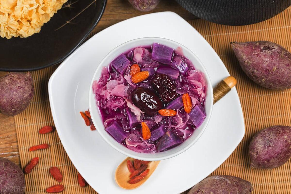 2、鍋中加水,放入銀耳,小火燉煮至出膠。加入紫薯塊繼續燉煮,直到紫薯熟透。放入冰糖調味,攪拌均勻即可。