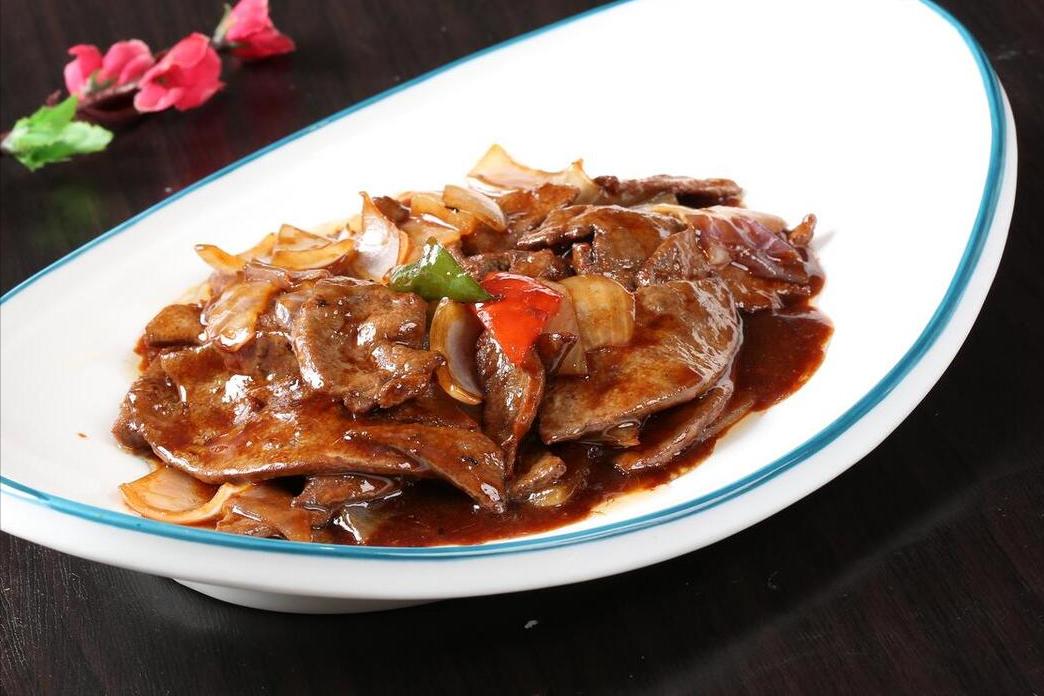 準備:豬肝、青椒、洋蔥、蔥姜、生抽、老抽、蠔油、料酒、食鹽、味精、白胡椒粉、澱粉、植物油