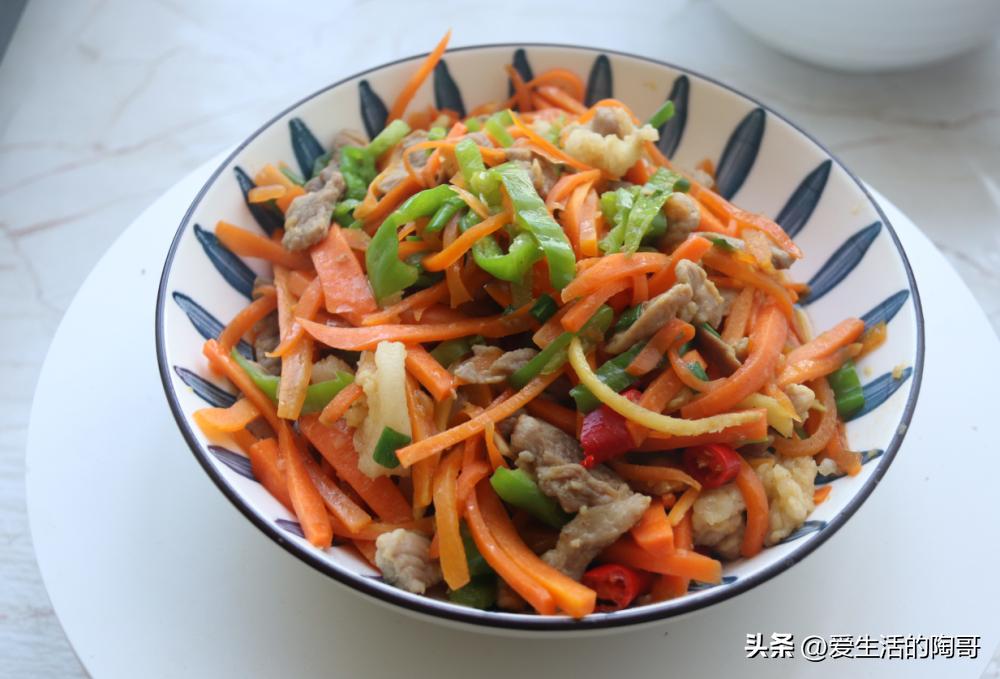 食材;胡蘿蔔1個,肉絲適量, 青椒1個,蔥,鹽,味極鮮