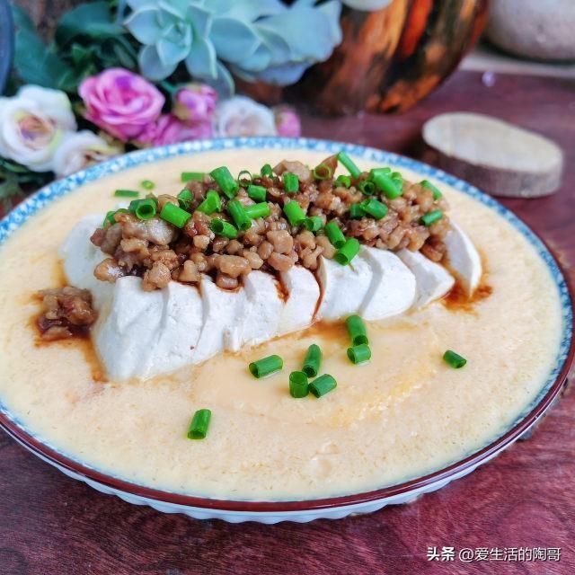 雞蛋豆腐搭配肉末一起蒸着喫,葷素搭配,營養充足,好喫美味,孩子們特別喜歡喫。