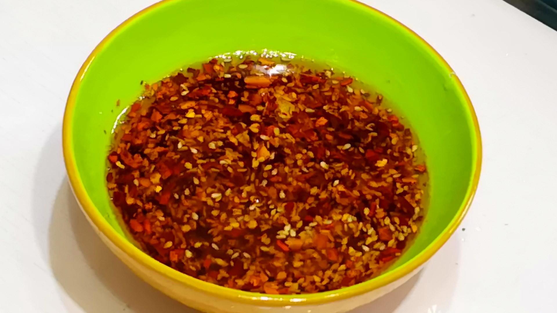 5.接着我們再來調個涼拌汁:先將蒜末放入小碗內,再分別 加入白芝麻和辣椒麪各一勺,然後將燒開的熱油倒入激發出它們的香味後,再加入適量的白糖、陳醋、生抽、香油和一勺蠔油,完全攪拌均勻即可。