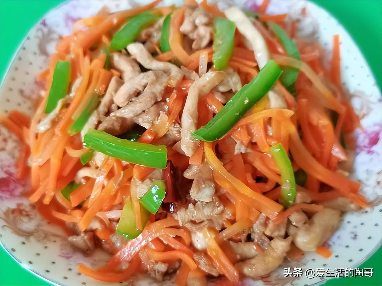 食材;胡蘿蔔1個,肉絲適量, 青椒1個,蔥,鹽,味極鮮