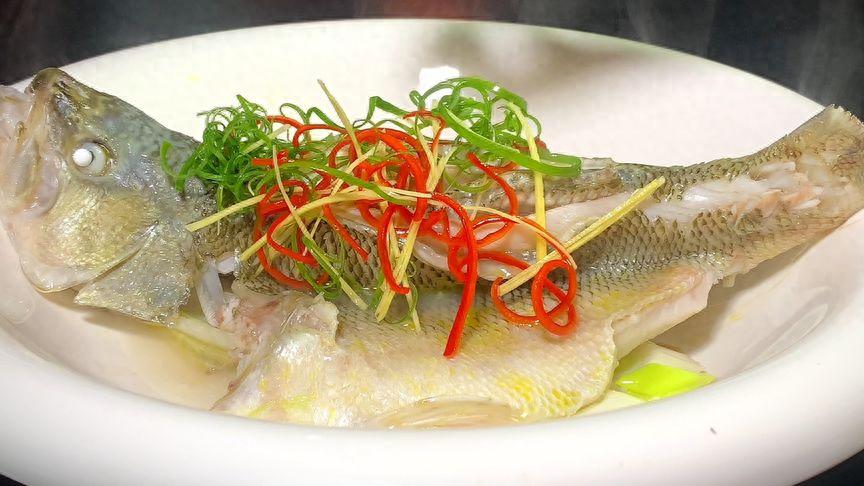 2、鍋中加水燒開,將醃製好的鱸魚放入蒸鍋中,大火蒸約 8-10 分鐘。蒸好後,取出鱸魚,倒掉盤中的汁水,去掉蔥薑絲。重新鋪上新鮮的蔥薑絲,淋上蒸魚豉油,最後澆上熱油即可。