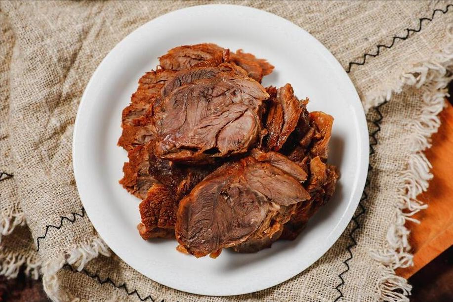 2、下面加上適量的紅燒醬油、料酒、黃豆醬、甜麪醬,抓拌均勻後醃製12個小時,醃製好以後倒在鍋子裏,順便來上適量的鹽和冰糖,蔥姜、八角、桂皮、香葉等也一起加進去,蓋上蓋子燉,燉上至少1個半小時的時間,關火後繼續泡上6個小時左右,出鍋切片開喫。