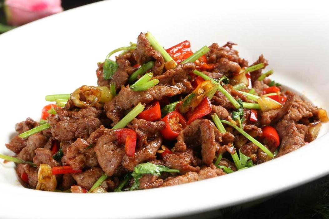 2、下面鍋子裏倒上食用油,然後將牛肉下進去,保持大火滑炒一會兒,直至變色後盛出來。接着將蔥薑蒜、香菜、小米椒倒進去,爆炒出香味,接着倒入牛肉,然後用鹽、味精、白糖、生抽、老抽、蠔油調味,炒勻後出鍋。