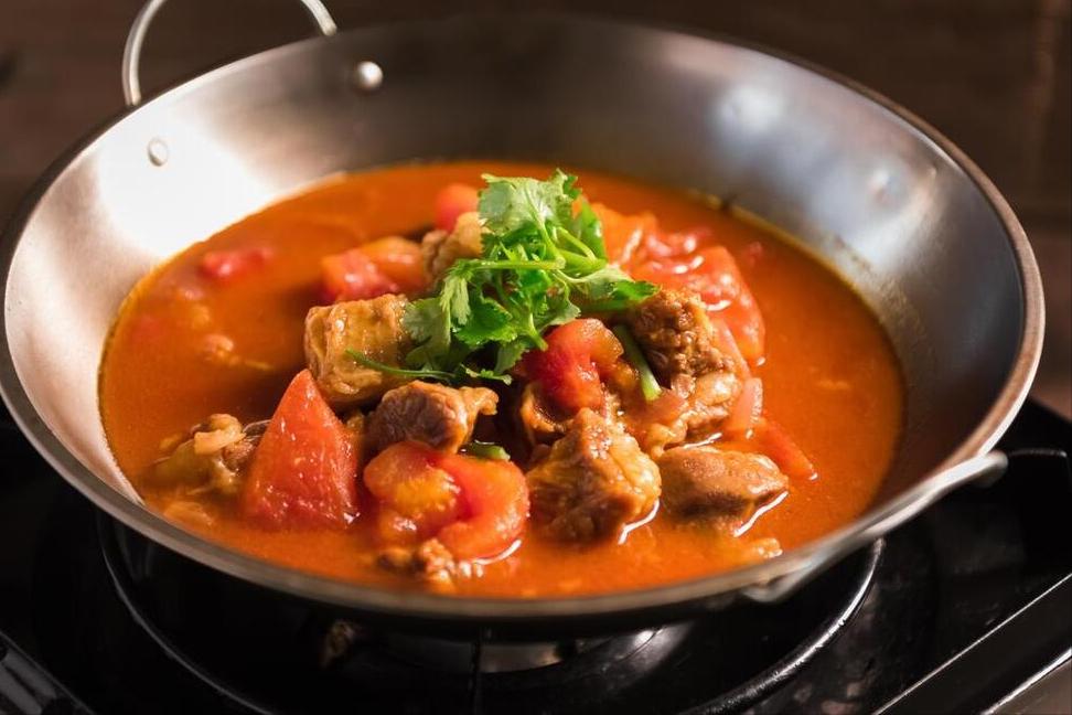 2、鍋中加油燒熱,下入冰糖炒出糖色,然後倒入牛腩翻炒上色,隨後把幹辣椒、蔥姜、香葉、八角倒進去,來1勺番茄醬、適量的生抽、老抽、料酒調味,接着添上水開始燉。大火燉開,小火燉1個小時,將土豆、番茄倒進去,順便來點鹽調味,繼續燉半個小時就可以開喫了。
