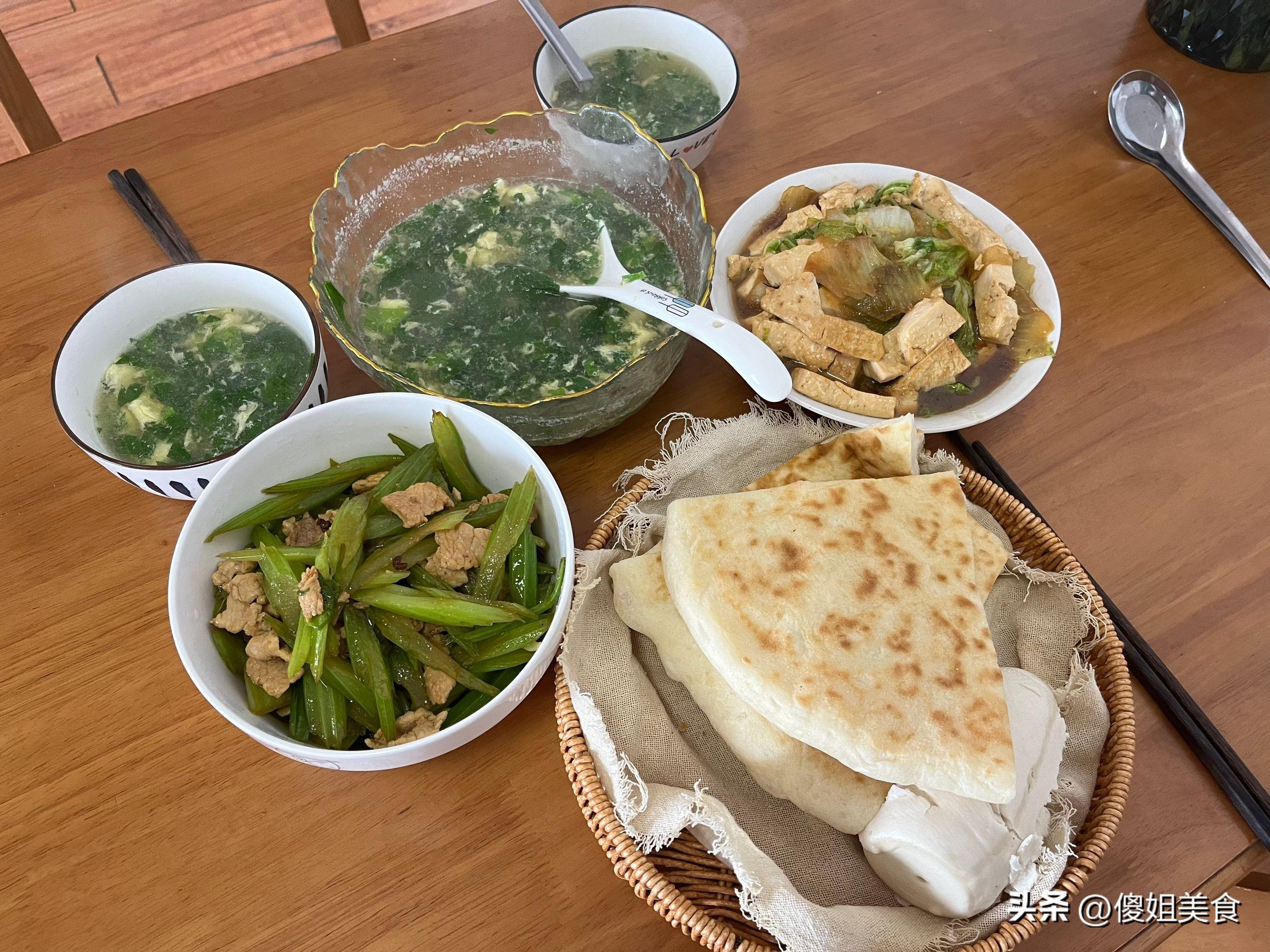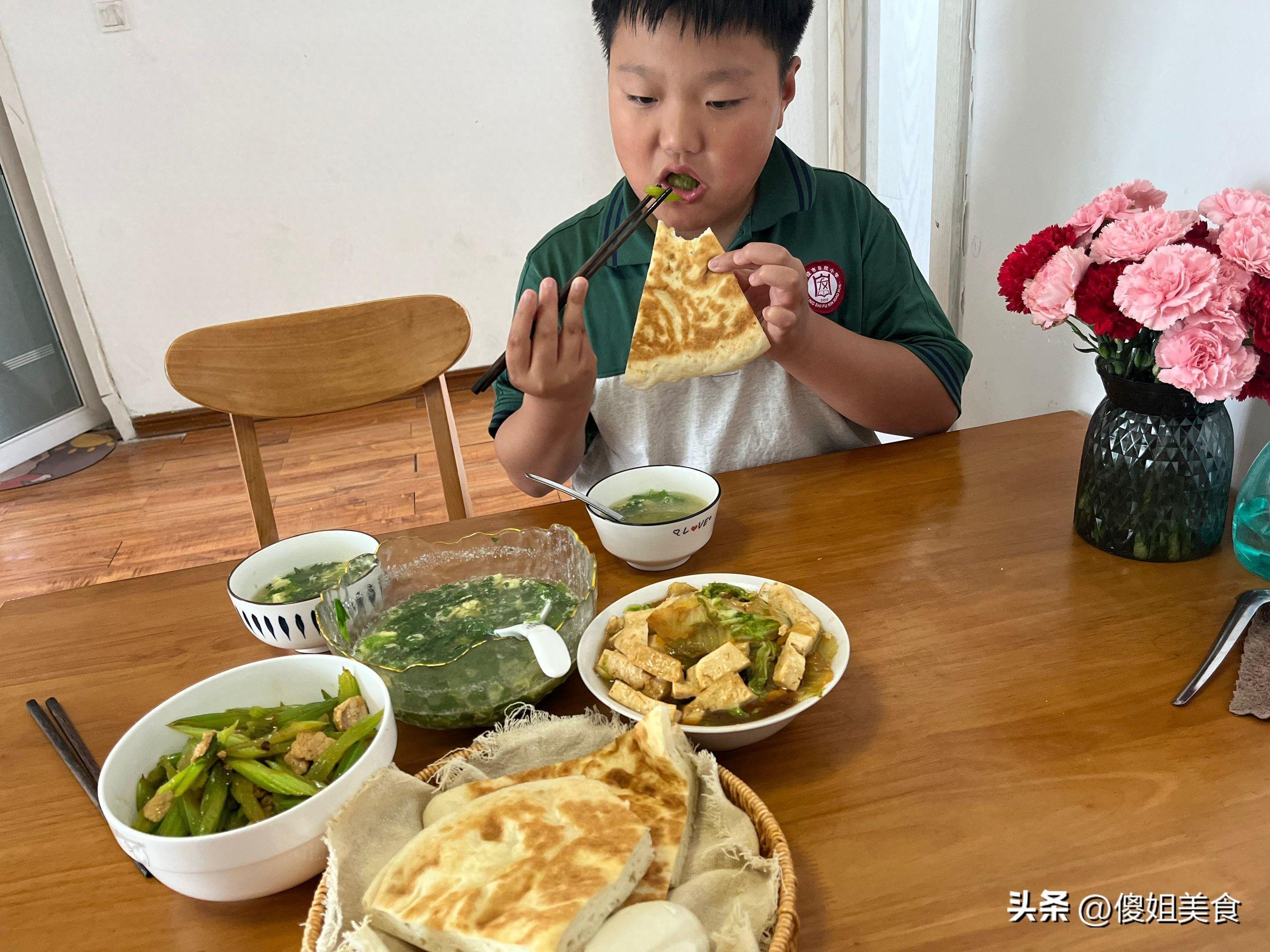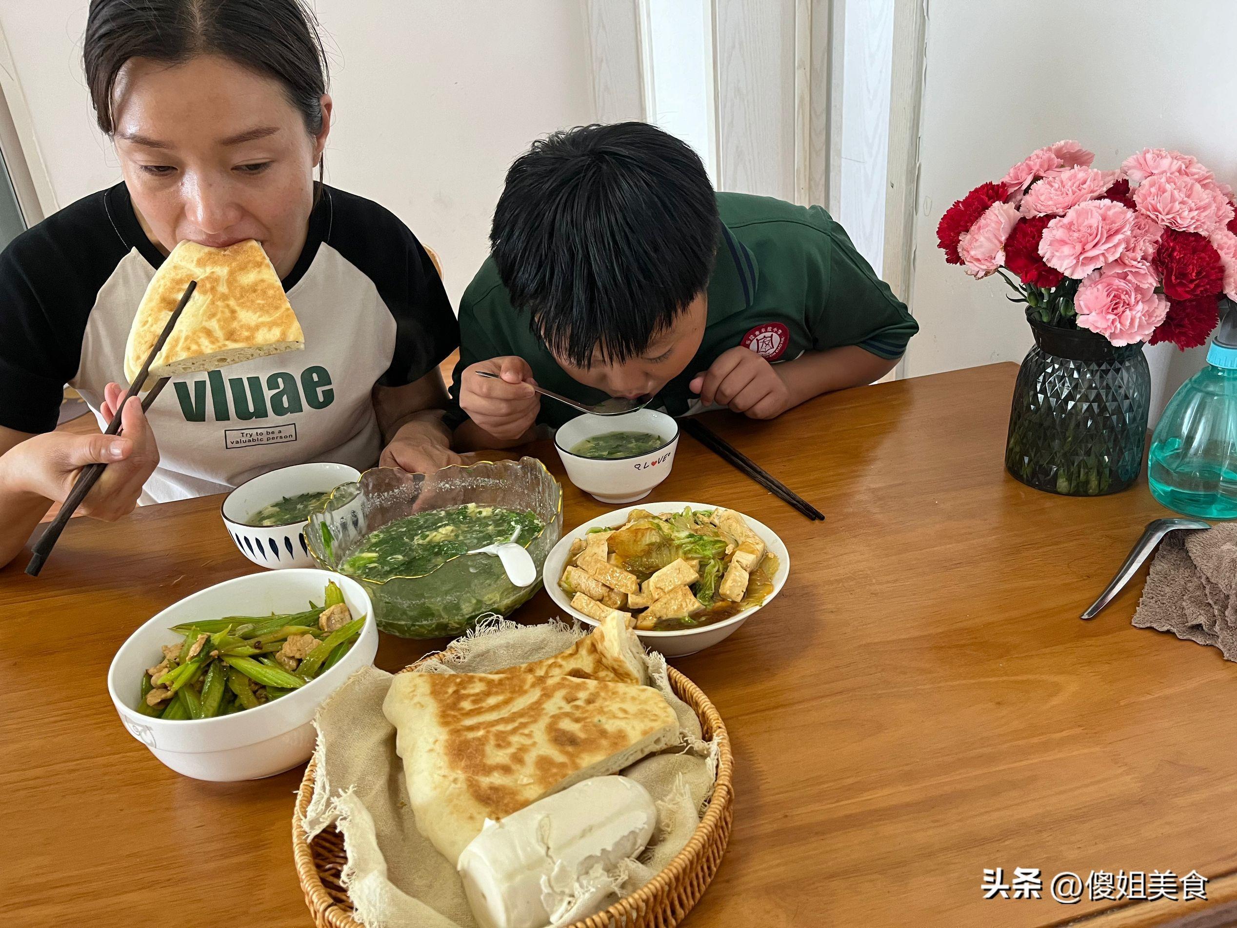 看兒子這飢餓的神態,先喝了碗湯壓壓飢餓,又喫了2大角餅和菜,我們娘兩個喫到最後都喫光了,沒有浪費一點,簡單家常的飯菜喫着才舒服,最主要是喫着健康。