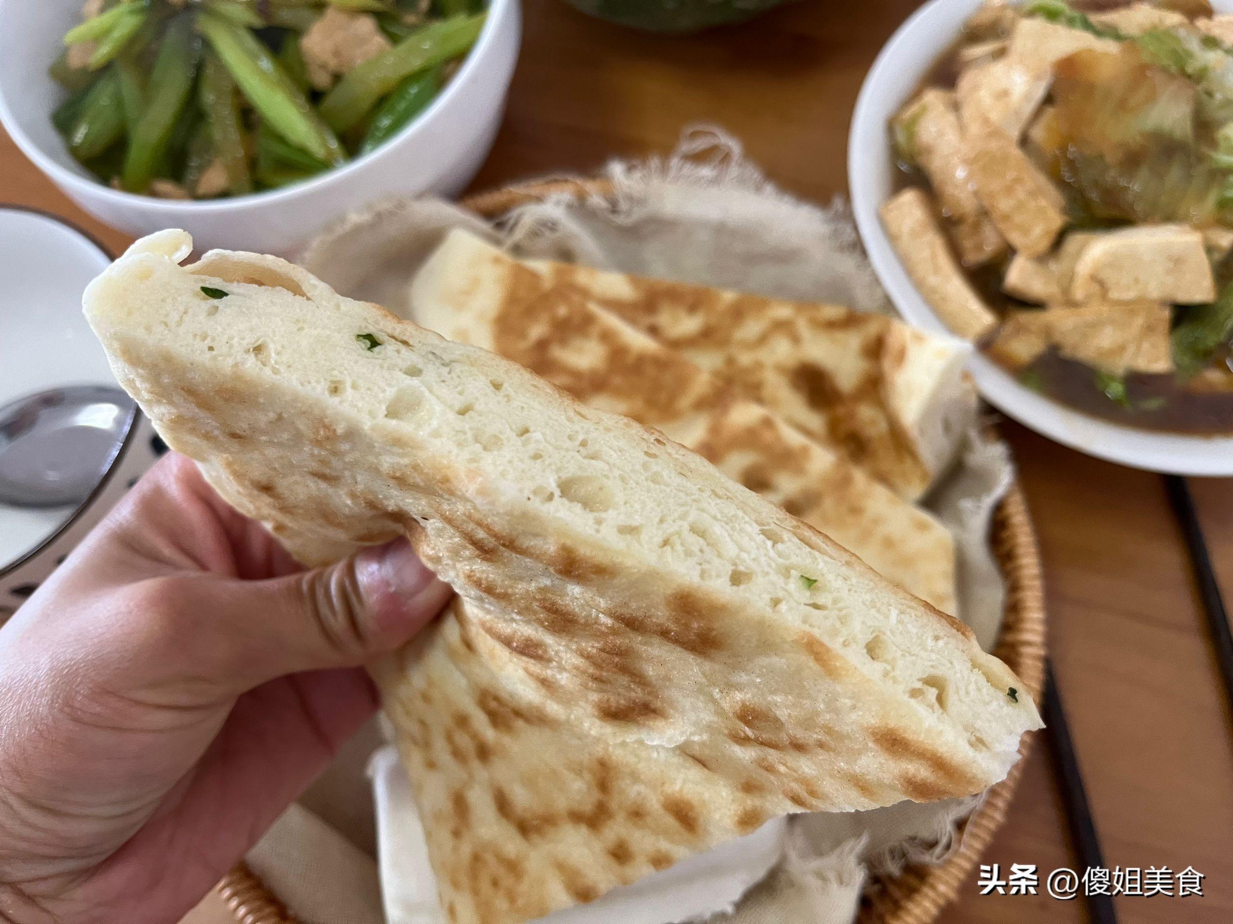 這個發麪餅可是我早上4點鐘就起來發的面烙的,用酵母粉發麪半個小時候就能好,發好面我還去晨跑了一個小時候,早上的空氣真好,跑一跑感覺渾身都很輕鬆。回來面醒發的賊好,使勁揉了一會,撒上蔥花擀成餅胚,用平底鍋烙上3分鐘,喧軟好喫的發麪餅就烙好了。
