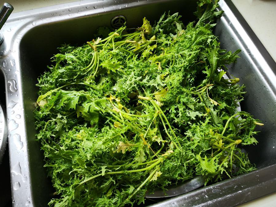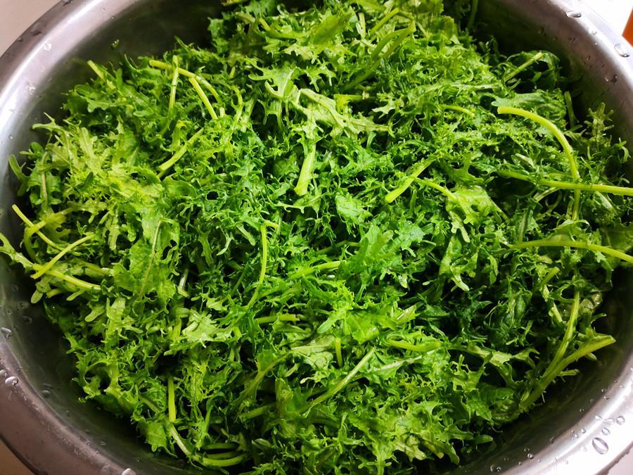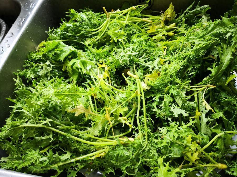 1.選取鮮嫩一點的芥菜秧子摘洗乾淨,如果時間來得及,最好放在淡鹽水中浸泡10分鐘,可以起到殺菌、去蟲卵的功效。