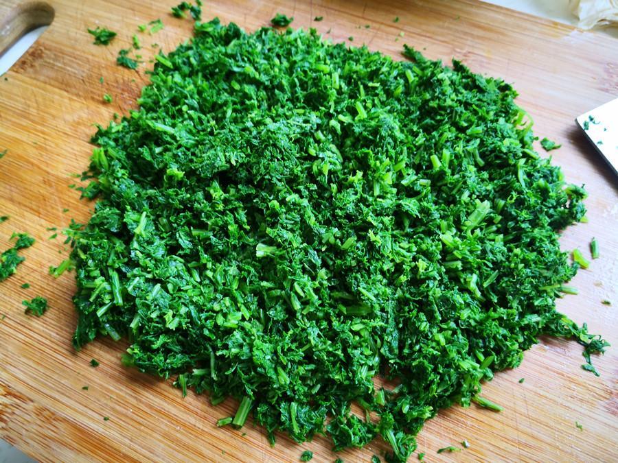 2.接着起鍋加水,水開後加一點食用油,於加一點鹽,然後下入芥菜秧子焯一下水,焯至芥菜秧子變軟後控水撈出,放到冷水中過涼,再瀝乾水分剁碎備用。