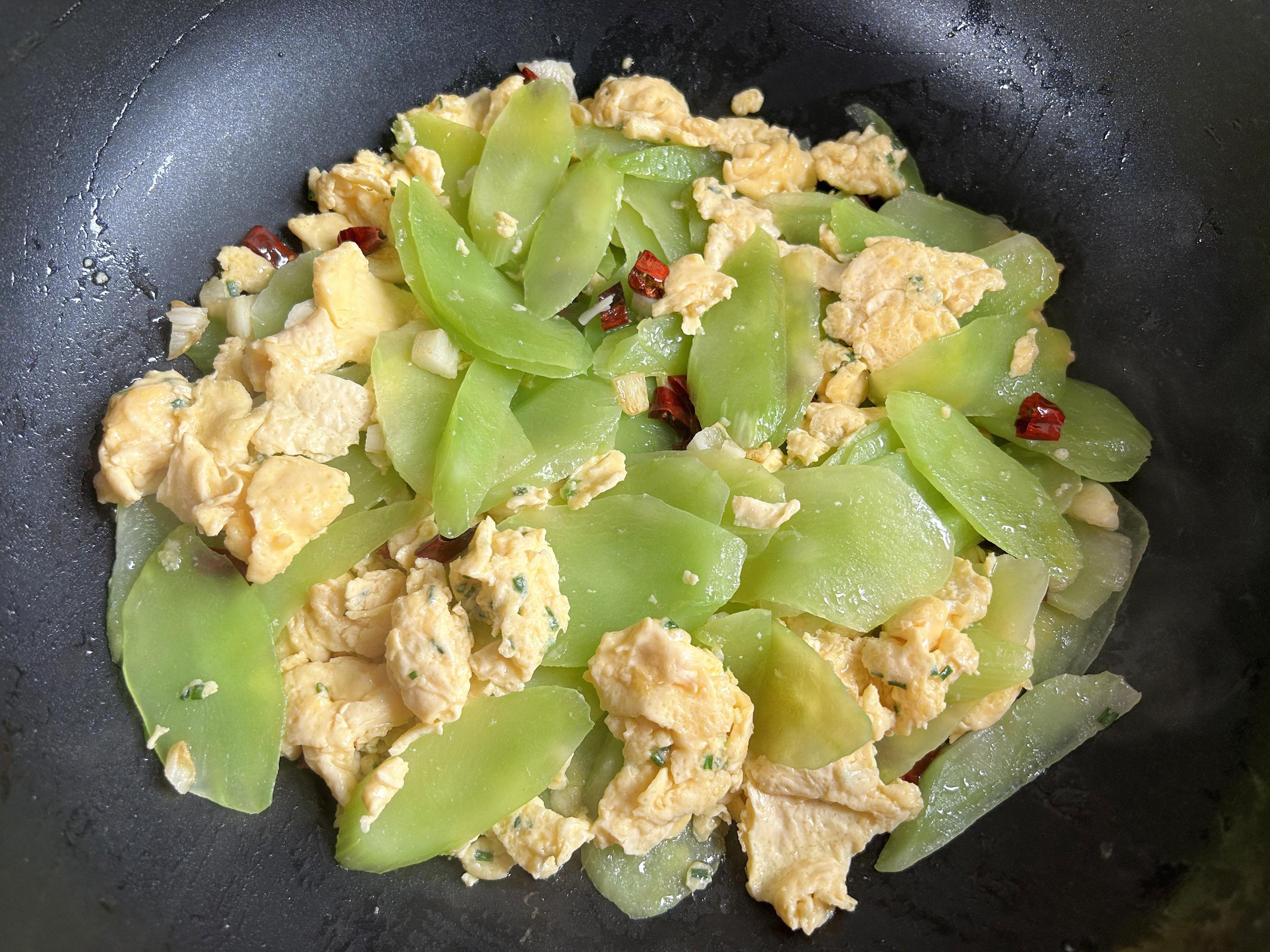 加入炒熟的雞蛋,翻炒均勻,這道香嫩爽脆、營養好喫的萵筍炒就做好了。萵筍和雞蛋都是加過鹽的,就不需要再放鹽調味了。