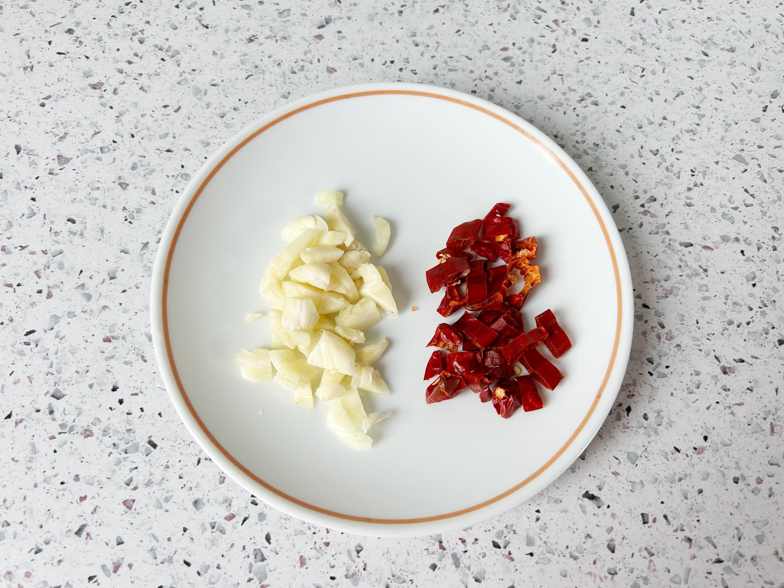 大蒜去皮切顆粒,幹辣椒切成小段備用。