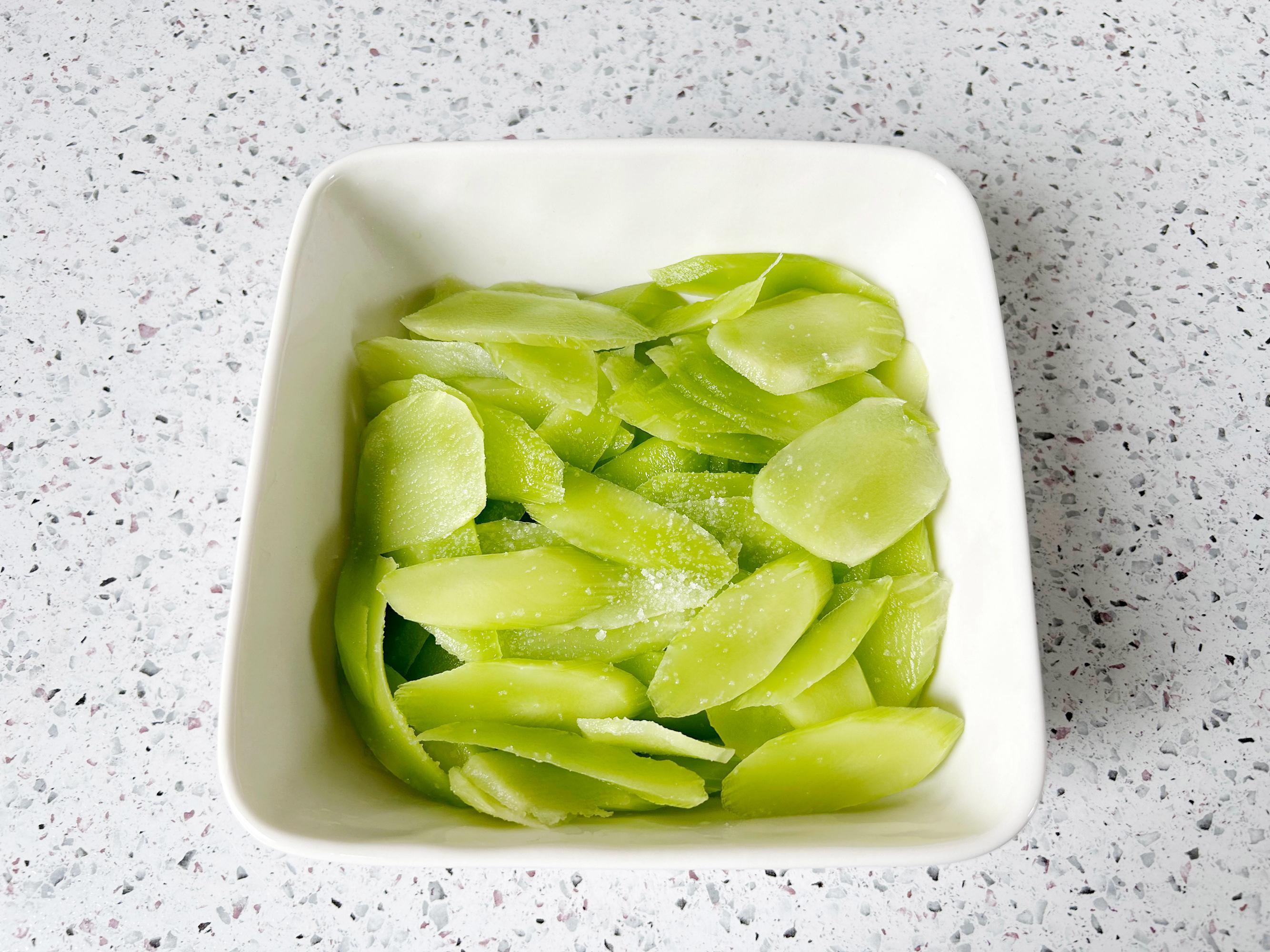 萵筍削皮,斜着切成薄片,加入適量的鹽醃製5分鐘,倒掉醃出來的水分,清洗乾淨,瀝乾水分。