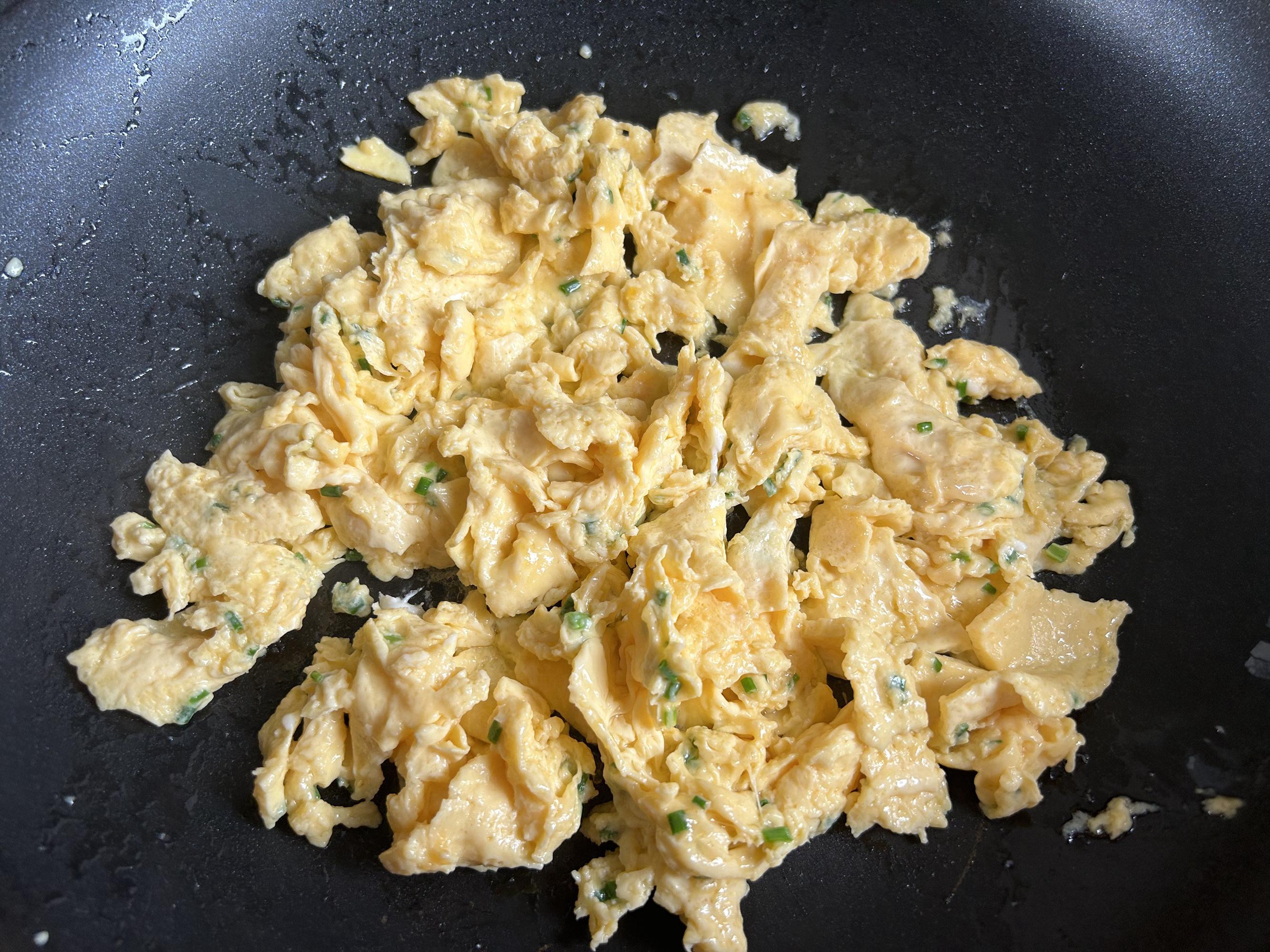 熱鍋放油,倒入雞蛋液煎到微微凝固,扒拉成小塊,盛出來備用。